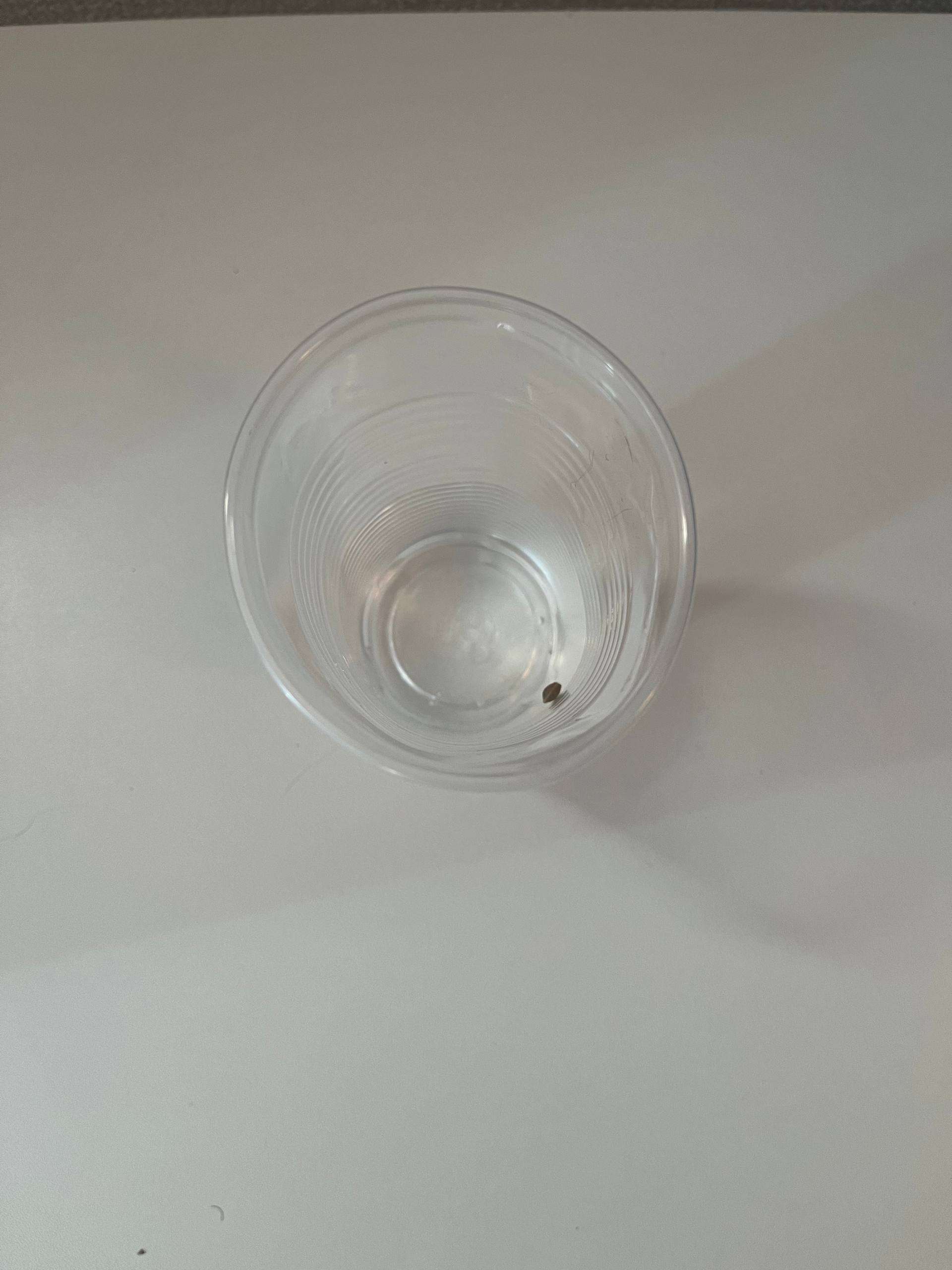 Всем салют, ну вот наступил следующий день, открыв глаза, сразу же пошел смотреть как там растишка, подняв стакан увидел что 🌱 вылезло, но не скинула еще каску. Побрызгав один раз с пулика на растение закрыл стакан и ушел.