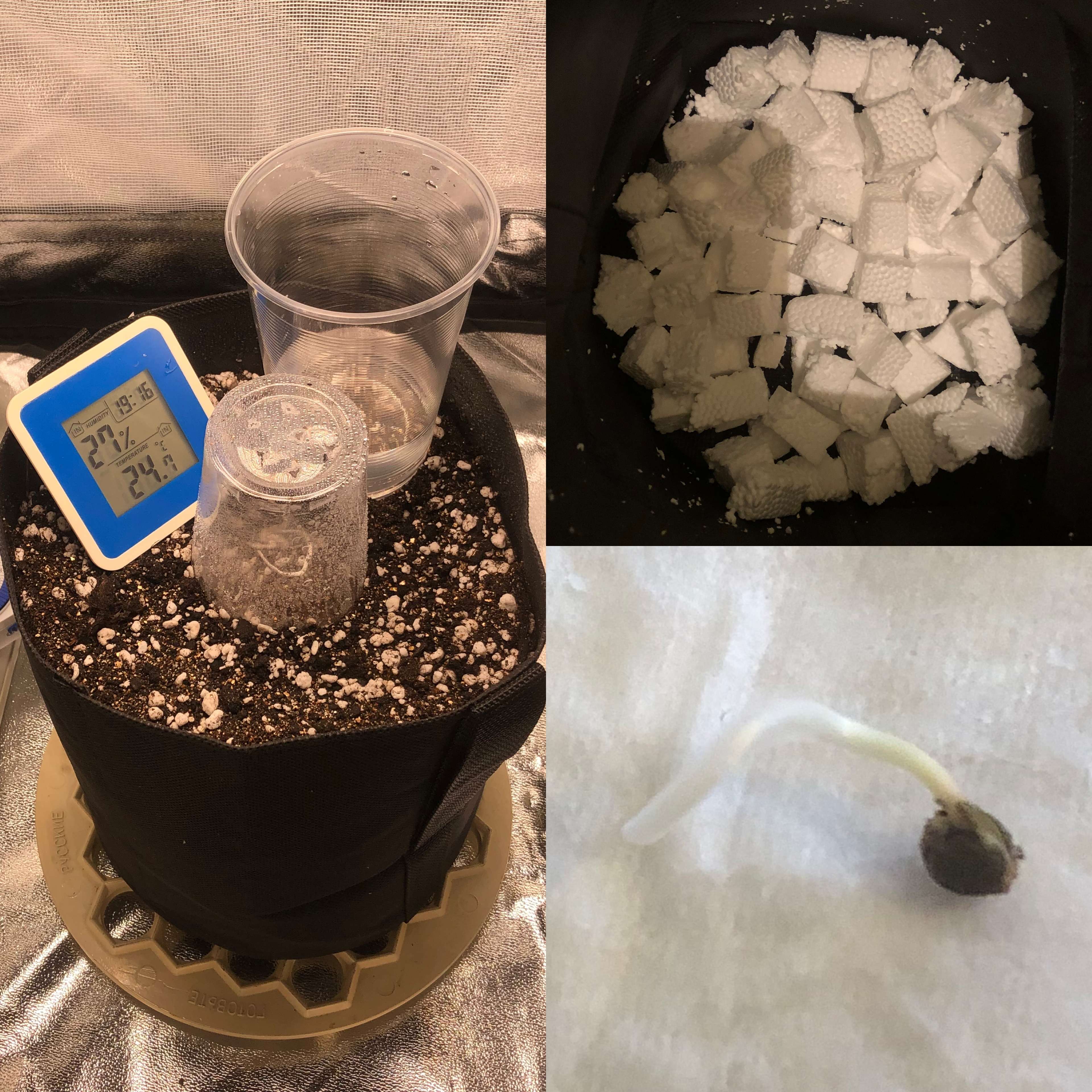 19.01 Ближе к вечеру приехал текстильный горшок, аккурат за два дня пророс корешок. На дно мешка насыпал кубиков из пенопласта, хоть и не нужен дренаж в текстильном горшке расте.