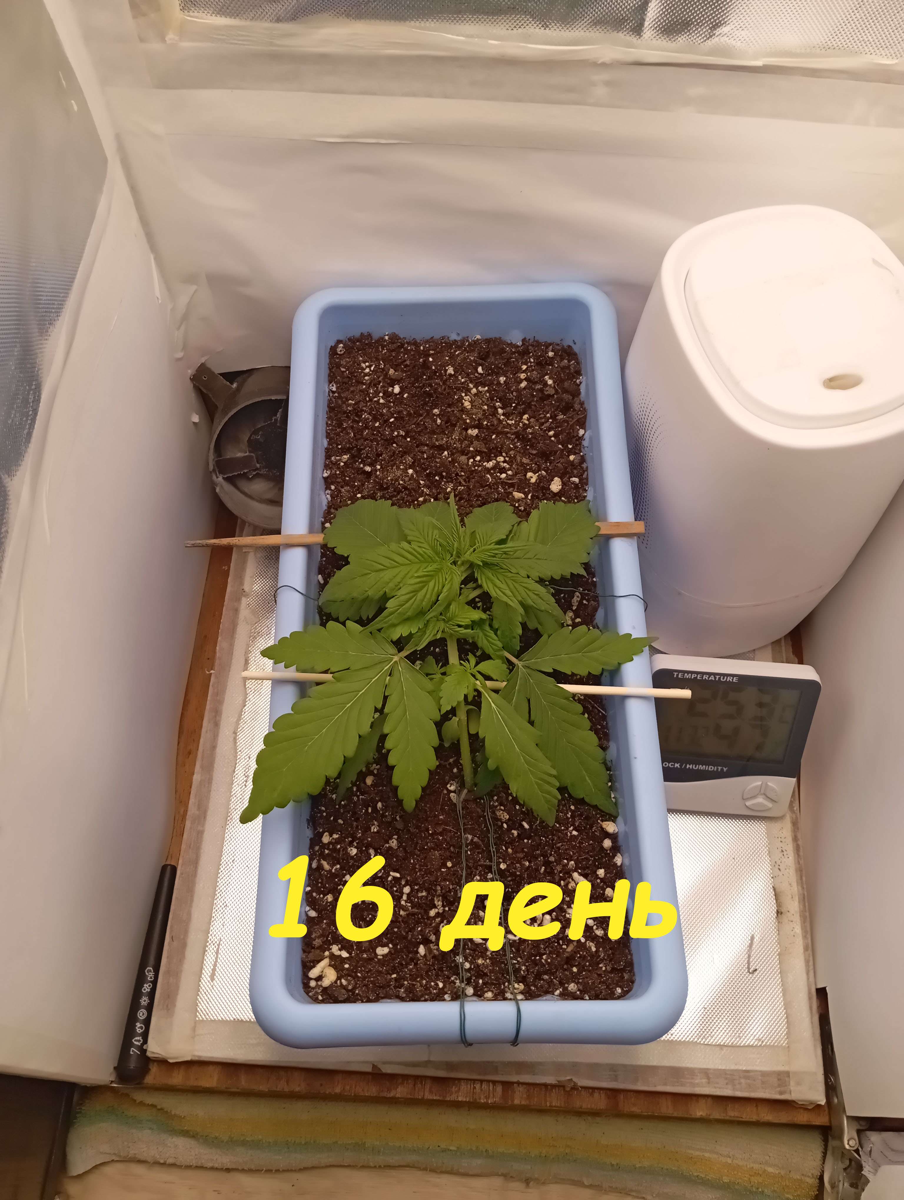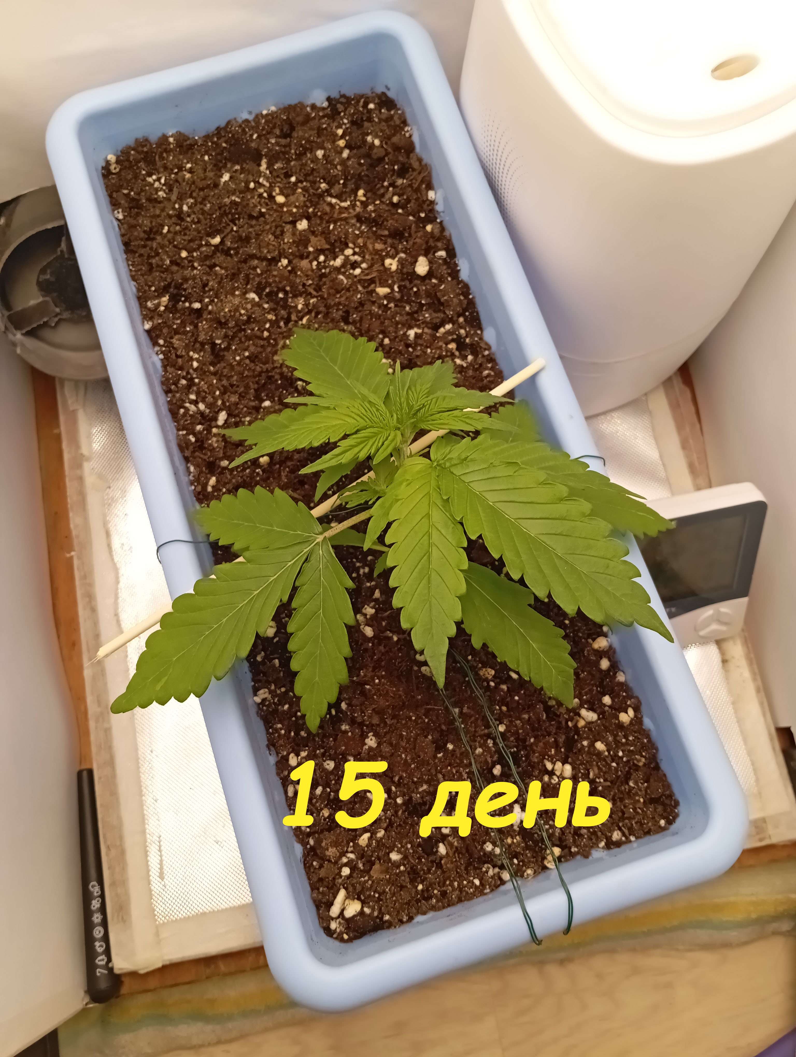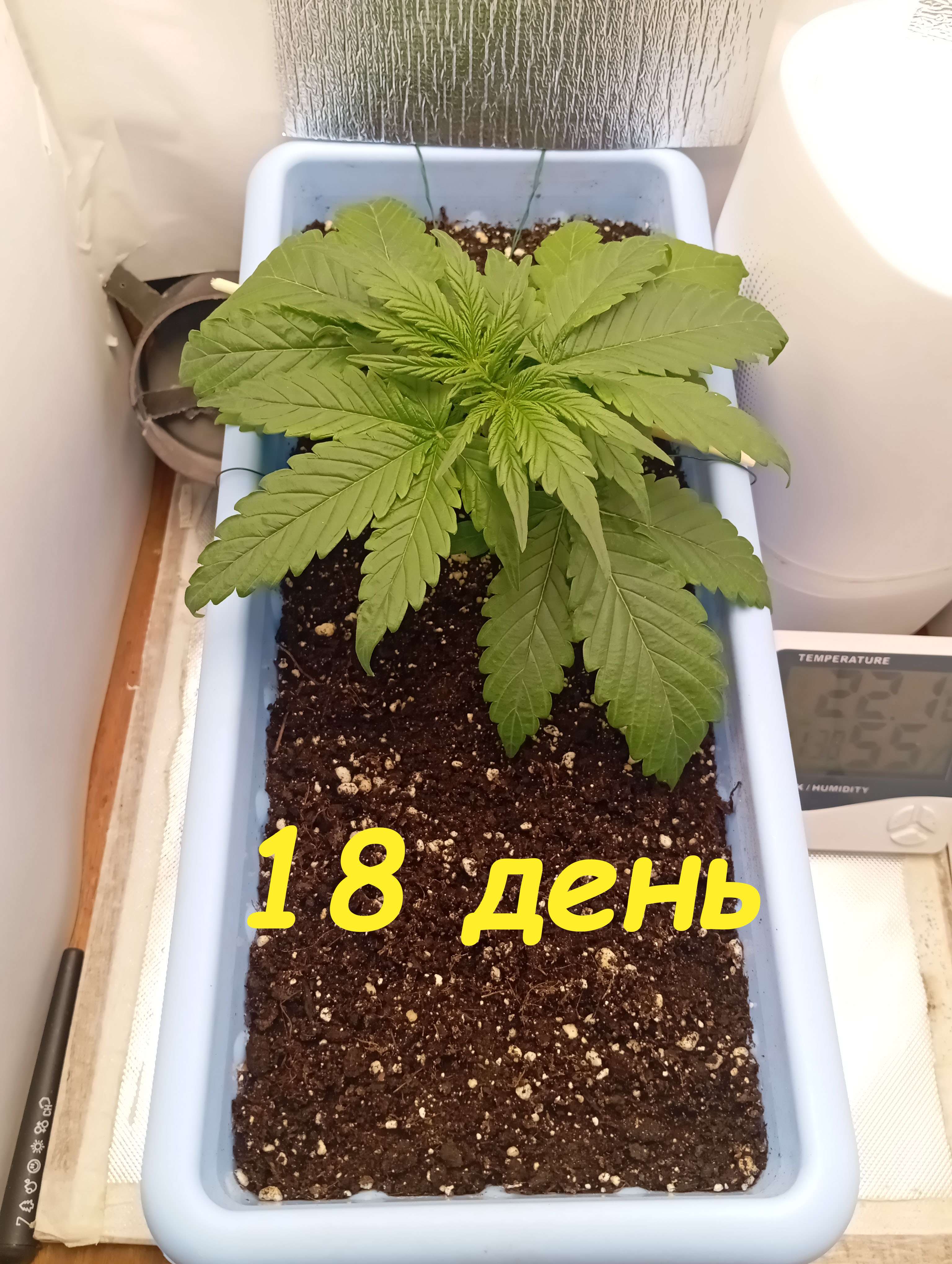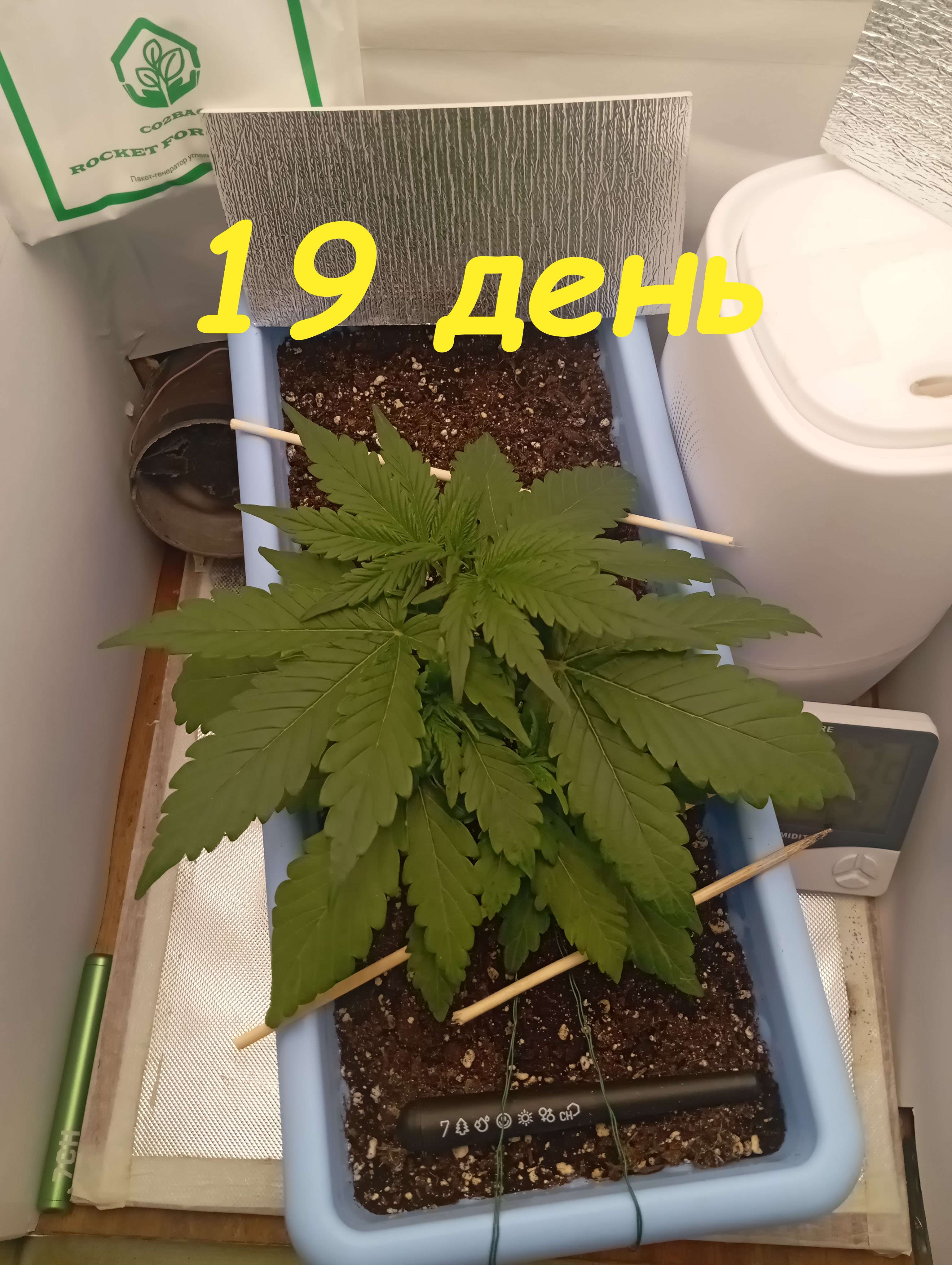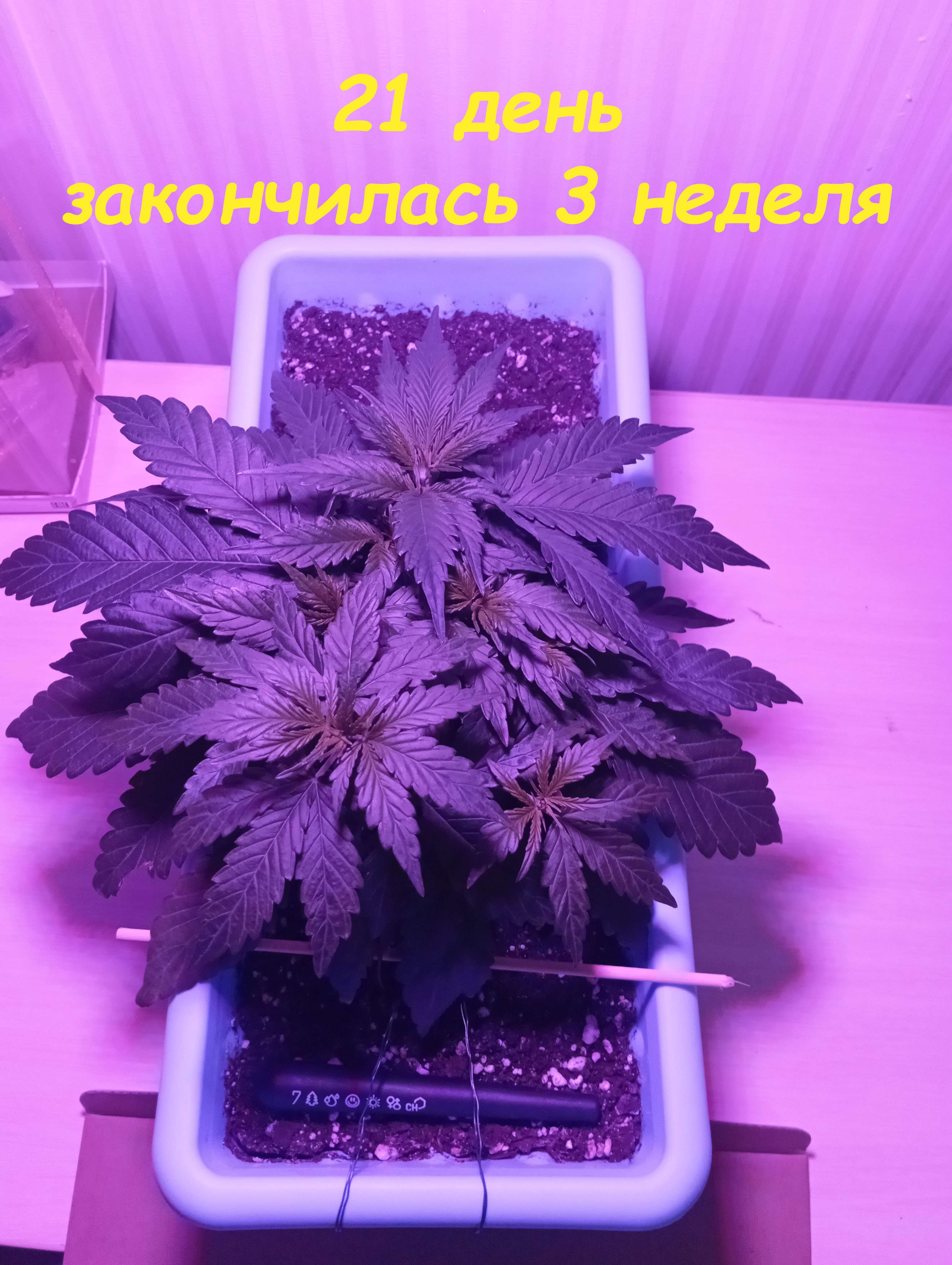 выставляю под фотолампу, растягиваю под ней, делаю Lst. По этому фото 21 дня - под сутенерским светом. Характеристики лампы - 50 вт, 4500к, 450, 660nm. Очень хорошо под ней тянется куст. Раньше часто не ней вегу делал, на цвет уже борд весил. Так же единоразово делал листовую подкормку АлгАмик+АктиВера по 2 мл/литр воды. Из за плохо сохнущего горшка полив удобрами 3 недели таблице, будет видимо в начале 4й недели. В бокс на этой неделе заехал пакет с СО2.