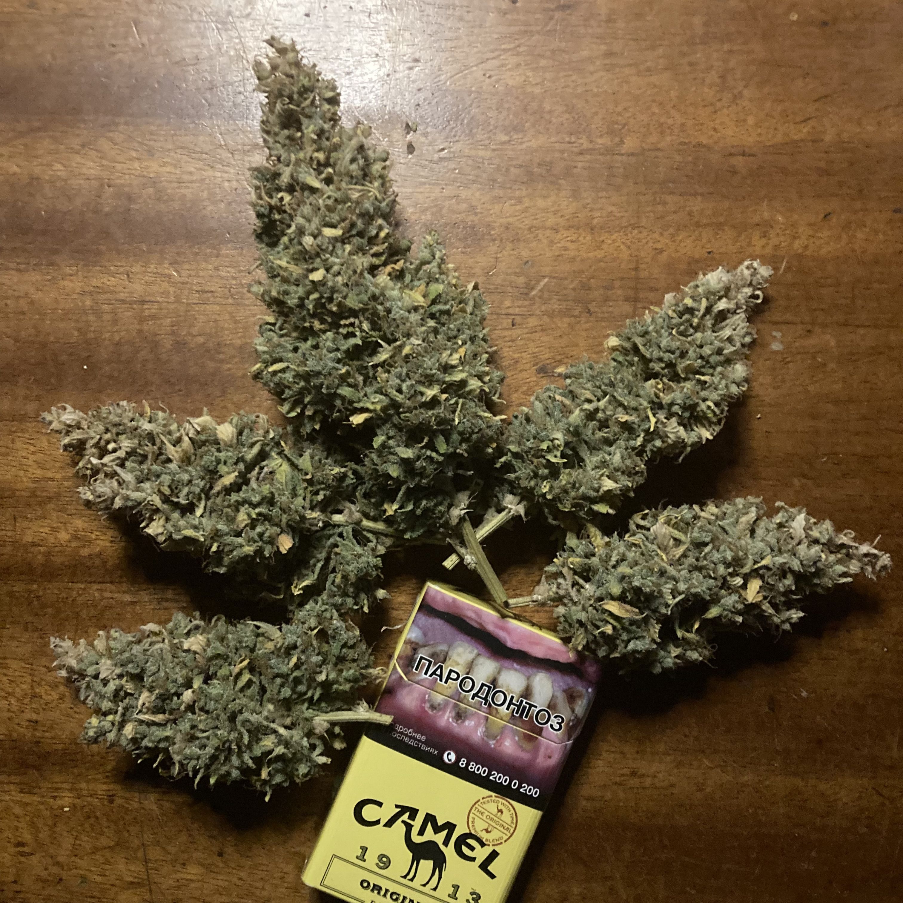 Бонусом вам пара фото с прошлых гровов этого стрейна: на первом шихи рядом с сигами, растила в 20 л. кашпо под ДНаТ (и ДРИ на веге). Снимала по 120 г., но долго: за 120 дней. На другом пять мешков по 10 л. под Q-бордами, 87 дней, по 55 на часах.