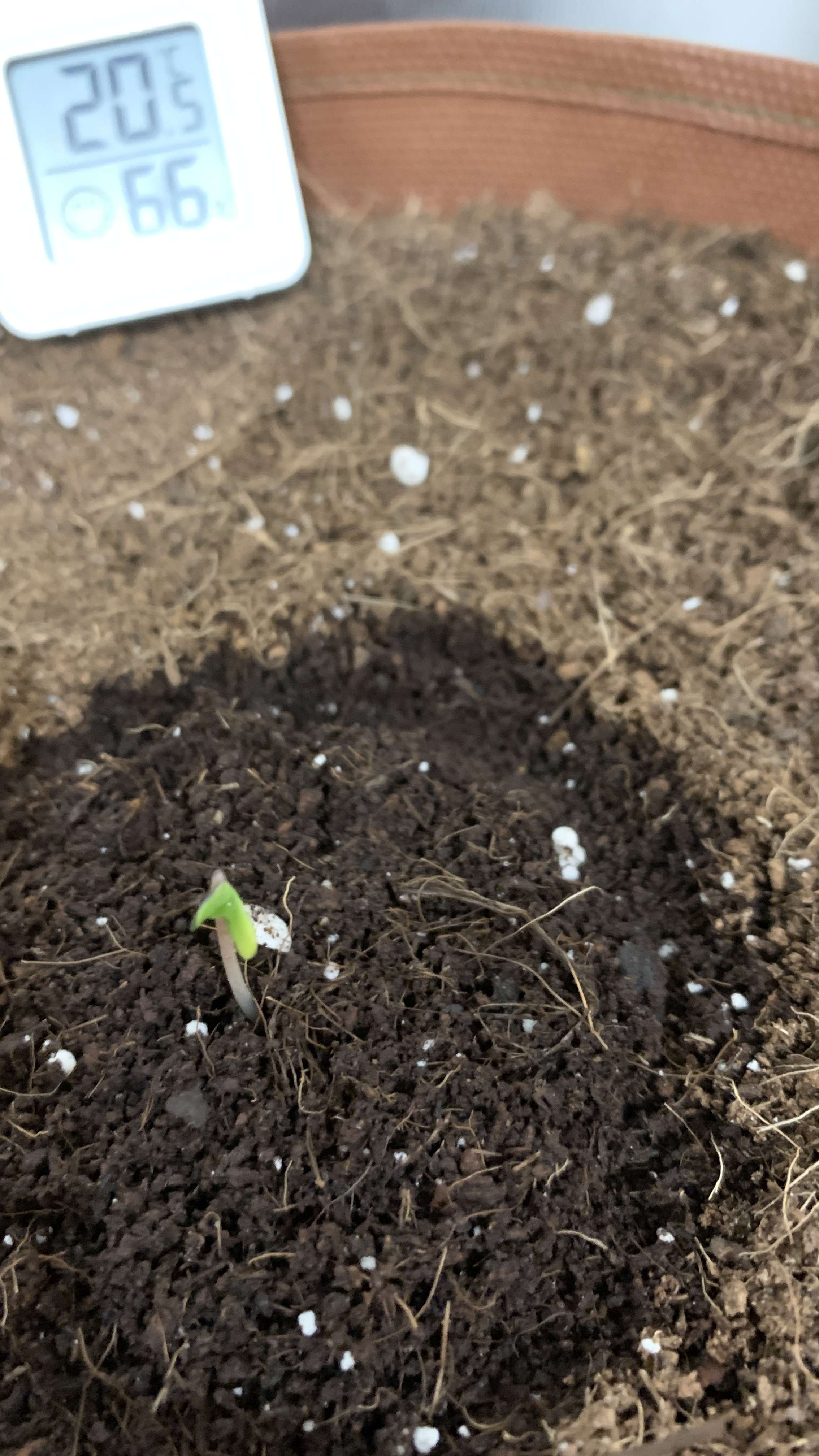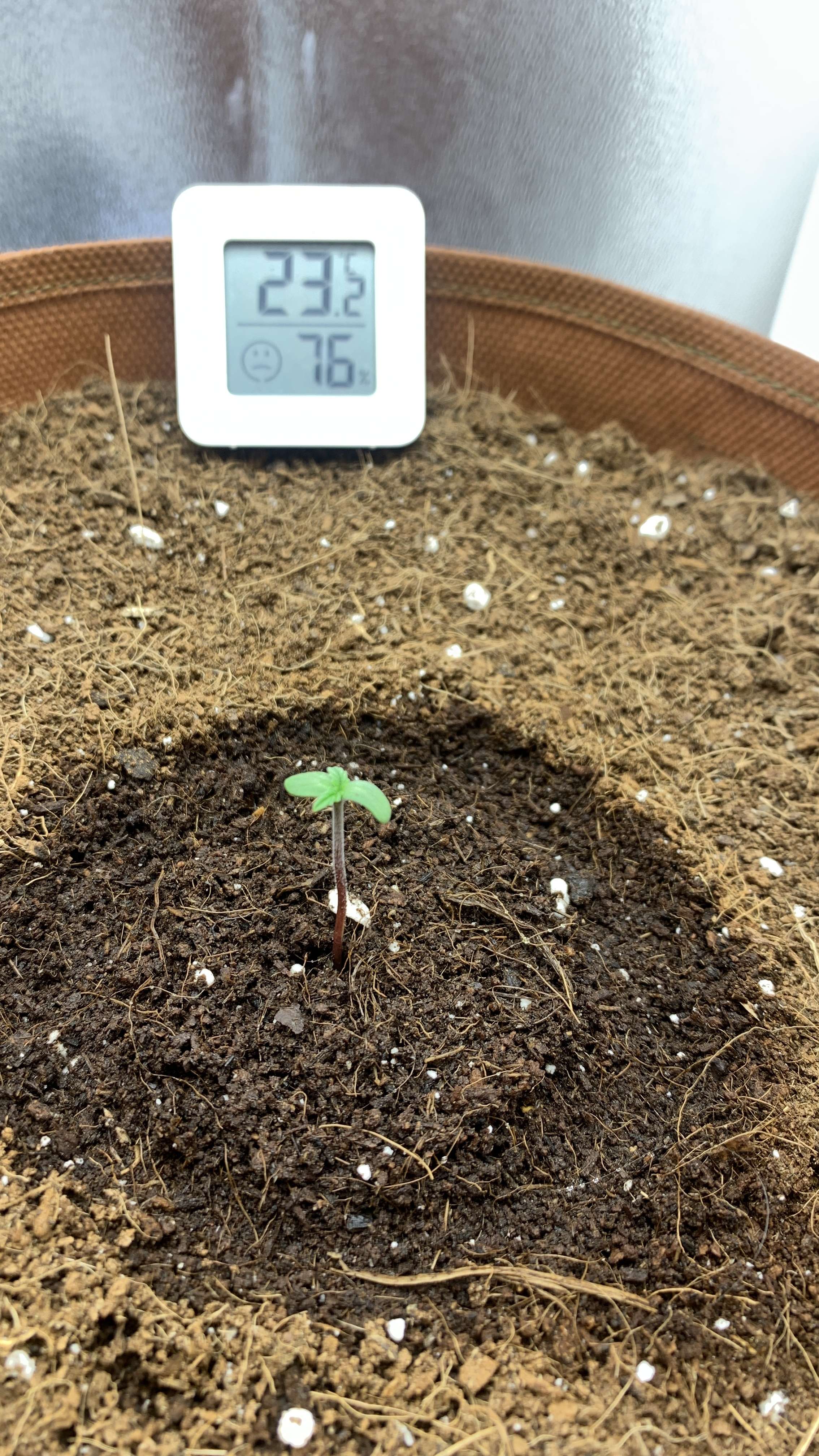 пшикнул грунт и накрывашку включил лампу, температура 22 градуса, влажность 75. В течении дня пшикал накрывашку несколько раз, грунт вокруг растишки влажный.