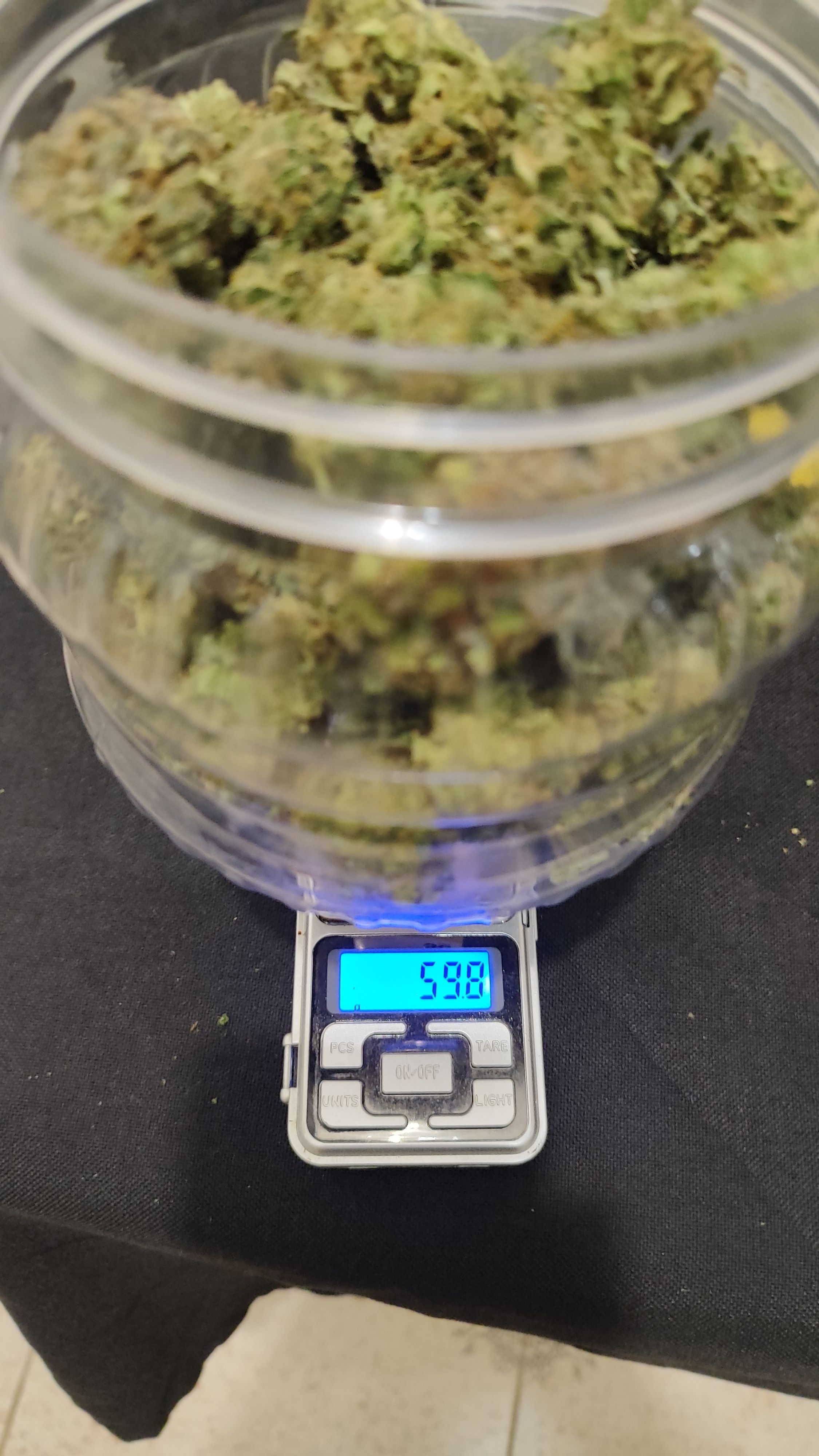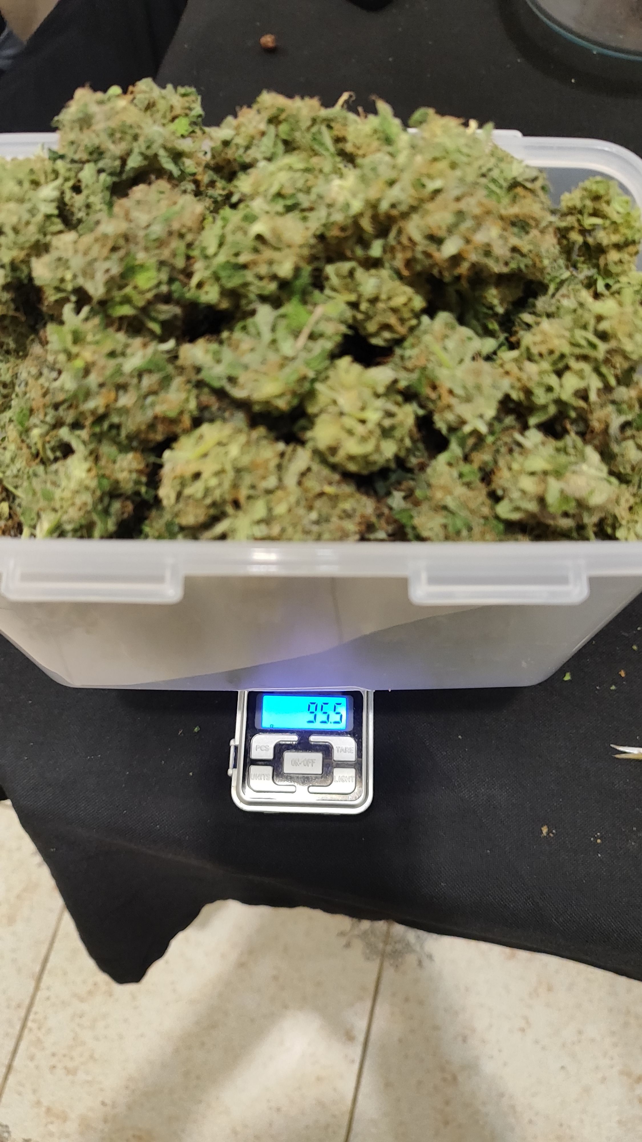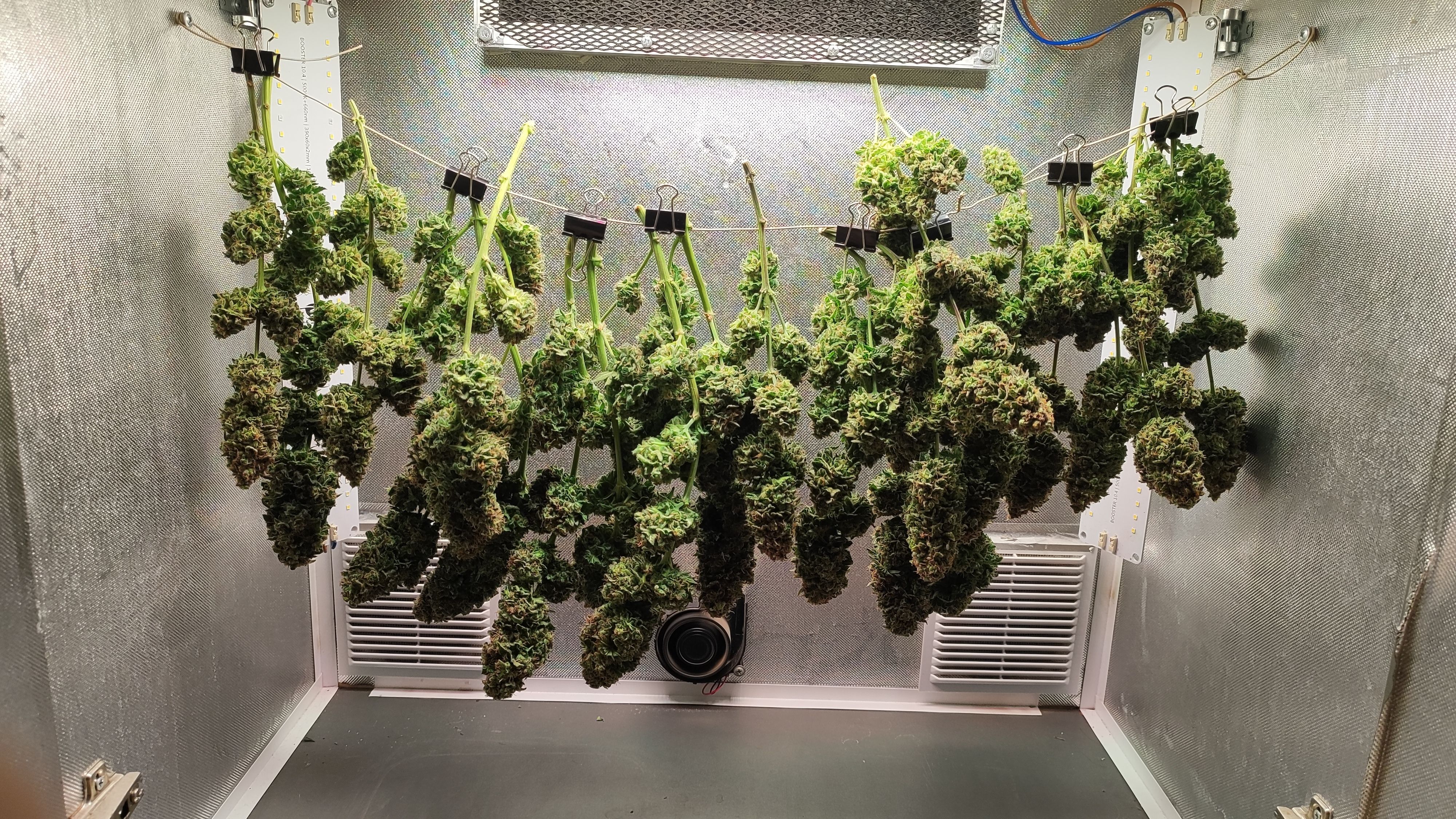 Пролил горшки кранухой, ph не ровнял литров по 20 на горшок. Последние недели не мог понизить влажность, была около 70%. Голодала около 3-4 дней, пару дней без света. 25 октября долгожданный харвест, 115 дней от каски и 70 дней цвета. По весу 700+г оттримленных сырых шишек. Сушка в боксе при температуре 24, влажность 40-50%.