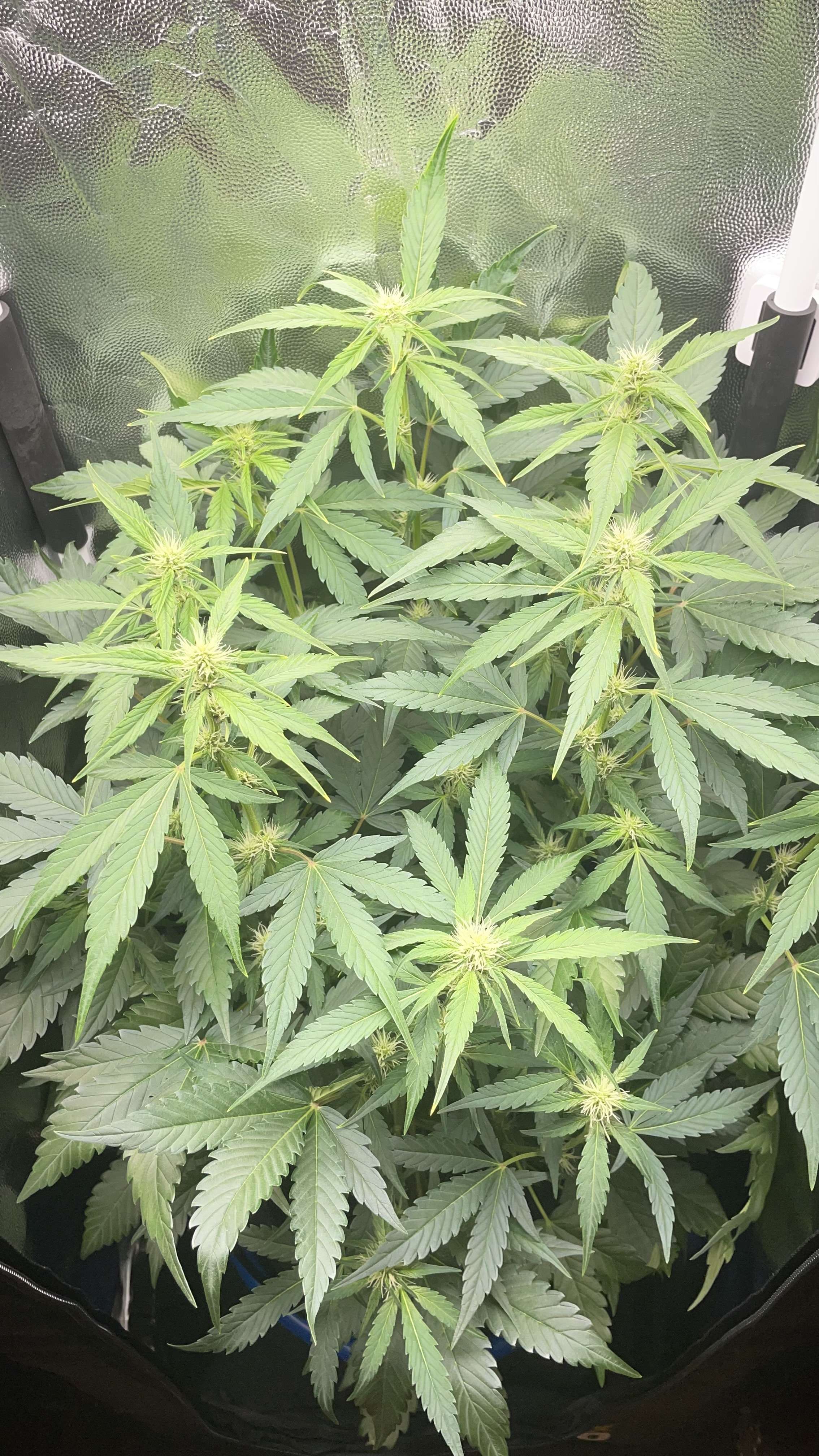 у меня похожие условия как у тебя - только я чуть впереди тебя по сроку грова.. И просто расскажу как может быть дальше: до твоей стадии всё шло похоже, а дальше начнёт прогрессировать пожелтение нижней листвы (похоже на дефицит азота) и одновременно начнут "отгорать" кончики верхней листвы - симптомы перекорма. А суть в другом: происходит блокировка корневой системы.. и сколько не лей дальше удобрений , симптомы "голода" только усилятся. Спасение одно - проливай грунт... и проливать надо прям очень много. Сначала "размочи" его проливом и через 3-4 часа проливай 12-15 литрами воды. Когда дренаж выйдет, то увидишь, что первые дренажи это очень тёмно-жёлтый раствор и консистенция как у желе.. Я понял что "засол" грунта происходит вне зависимости от входящёй воды по PPM - там хоть дистиллеровку лей, всё равно к 7-8 неделе грова будет засол с блокировкой в грунте если не промывать... из-за этого теперь только на кокосе хочу гровить.