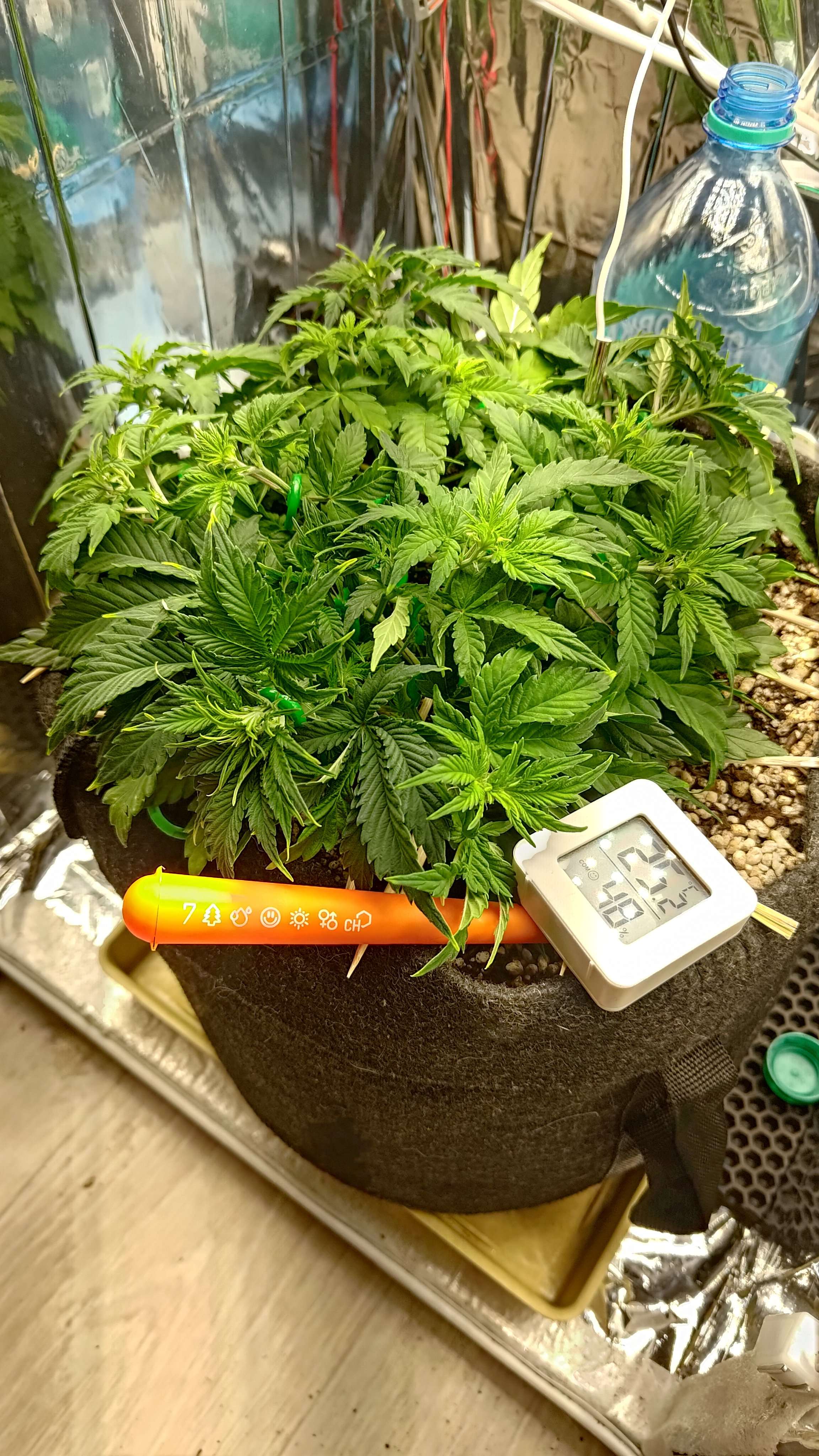 Никаких манипуляций с растением, отдыхает, привыкает к условиям. Кстати эти самые условия у концу недели хочу изменить: добавить СО2 пакет и накрутить ещё лампы. Помня в начале когда я проверял борд было понятно что темпа будет высокой, а лишняя влажность нам не нужна в виде бутылок со льдом, соответственно пакет и был заказан для лучшей жизни при повышенной температуре.:attention