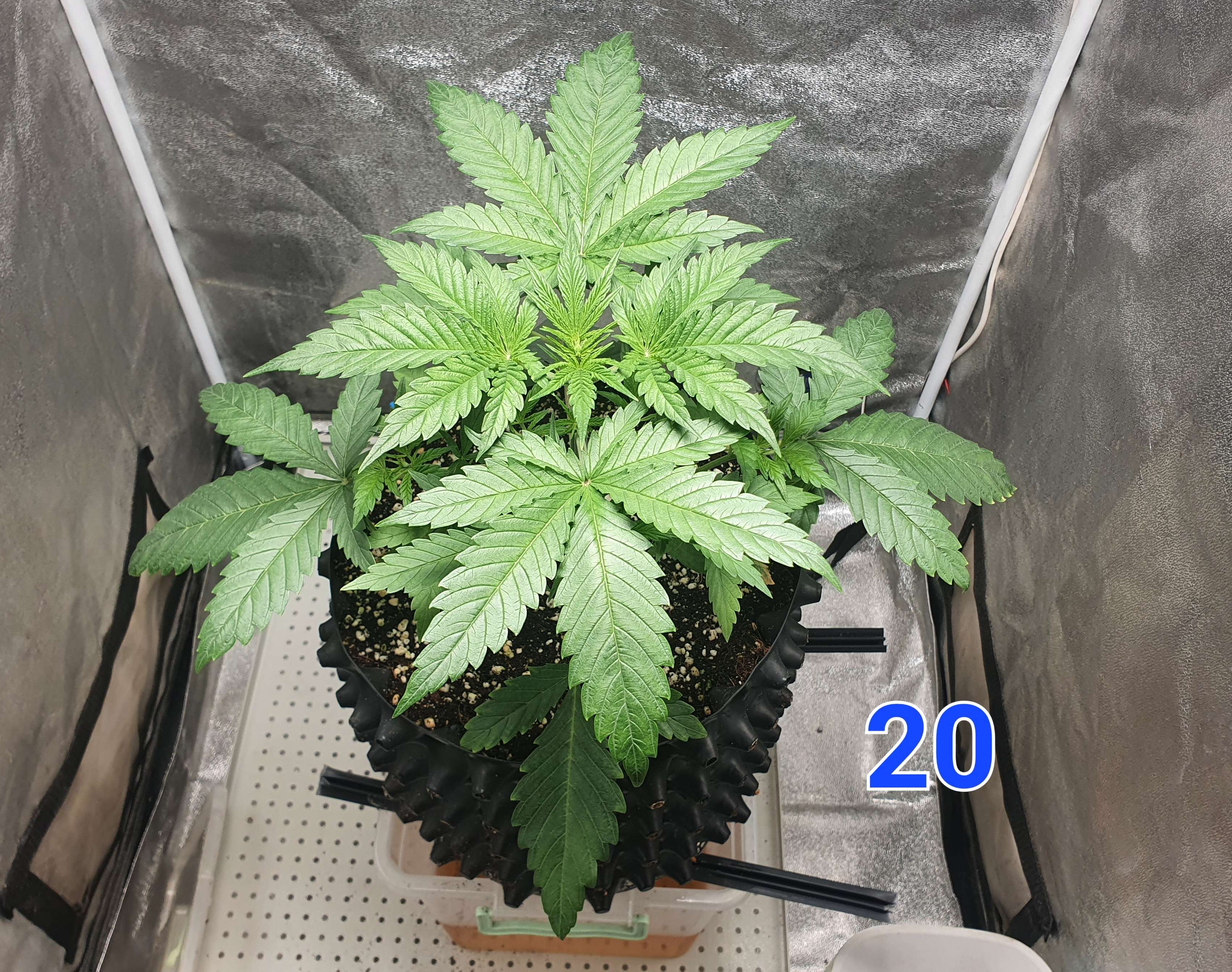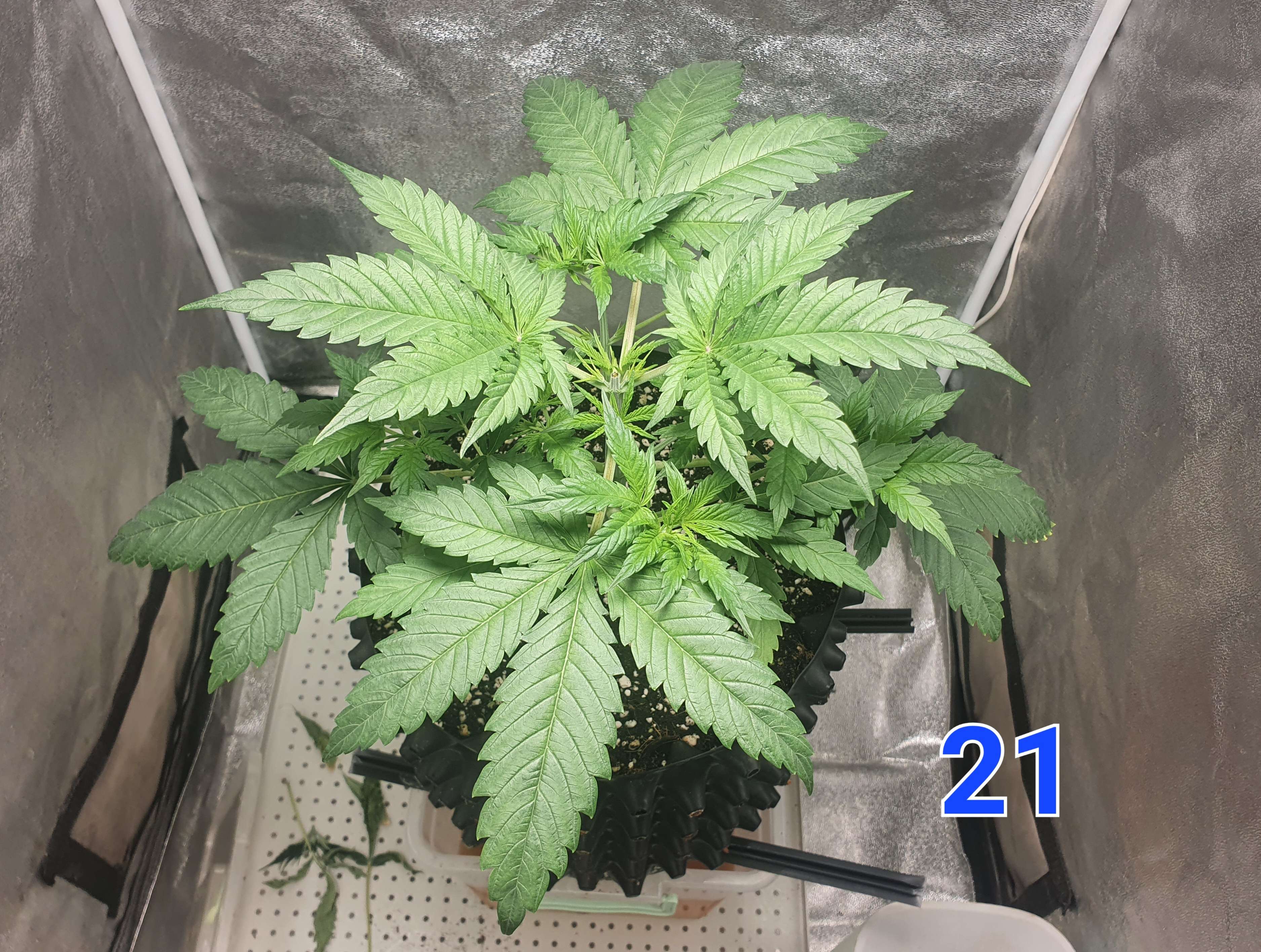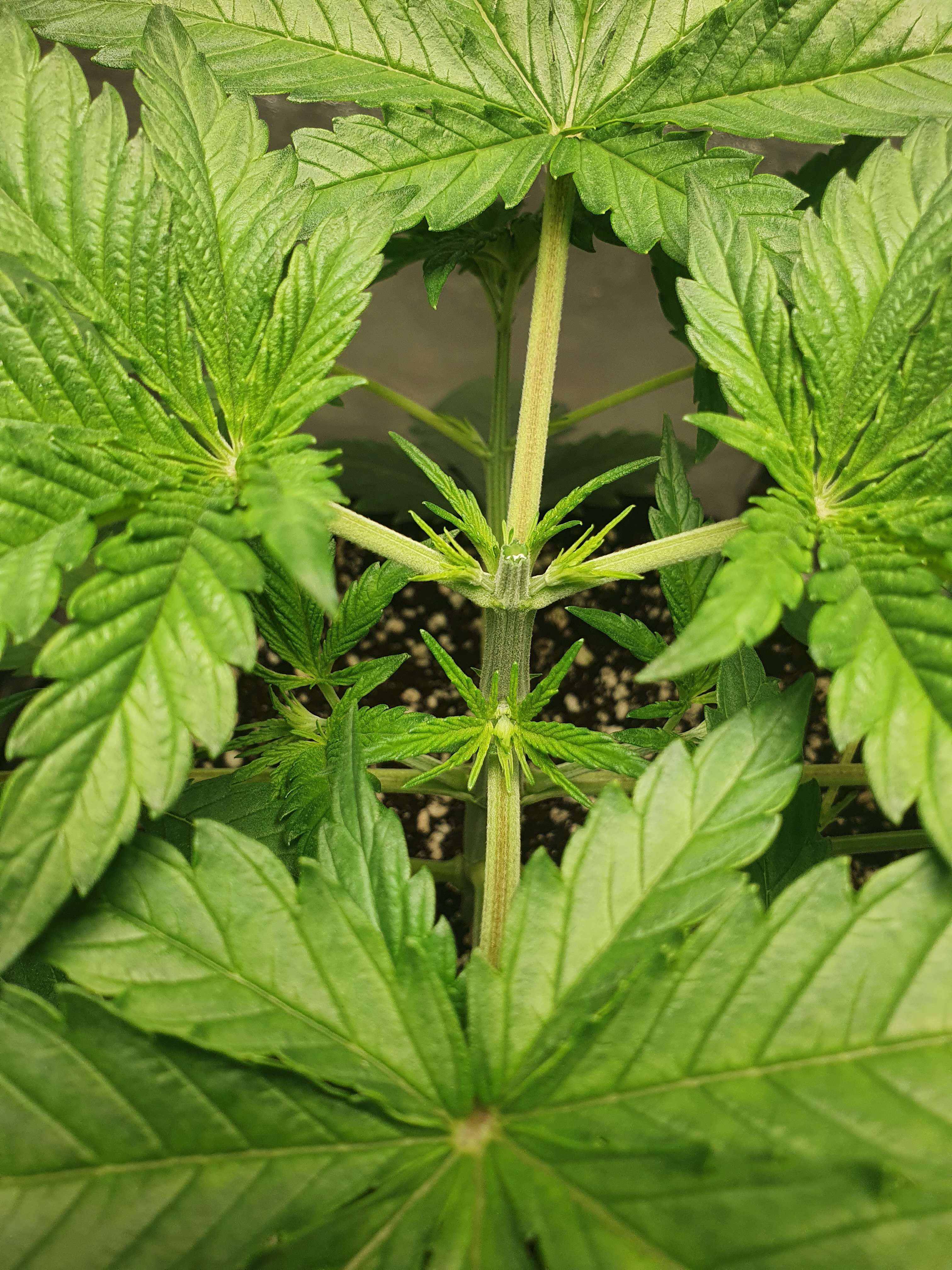 На 20м дне снёс макушку оставив 5 этажей. Первый этаж трогать не стал, ибо хорошо развивается. Так же убрал первых нижних 4 листа. После этого дал по листу стима grow от simplex.