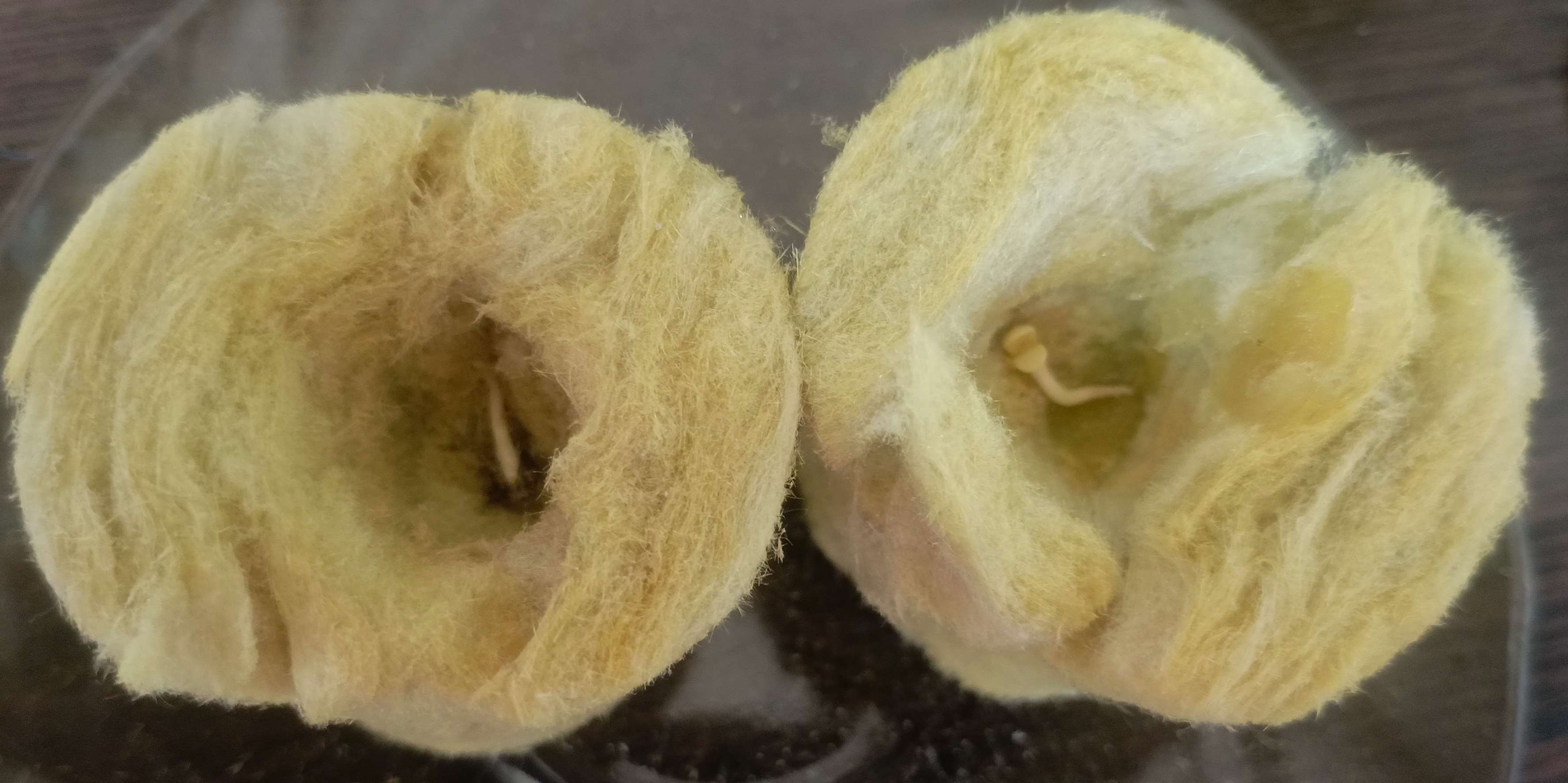 Всё по классике 50 мл воды и 10 капель перекиси на одно семя, 2 дня и корень уже больше самого семени, одно семя через два дня само скинуло каску, далее пересаживаю в минеральную вату, поливаю вату подготовленной водой для первой недели роста, вода и pro roots 3мл/15л, в ней ещё 2 дня.