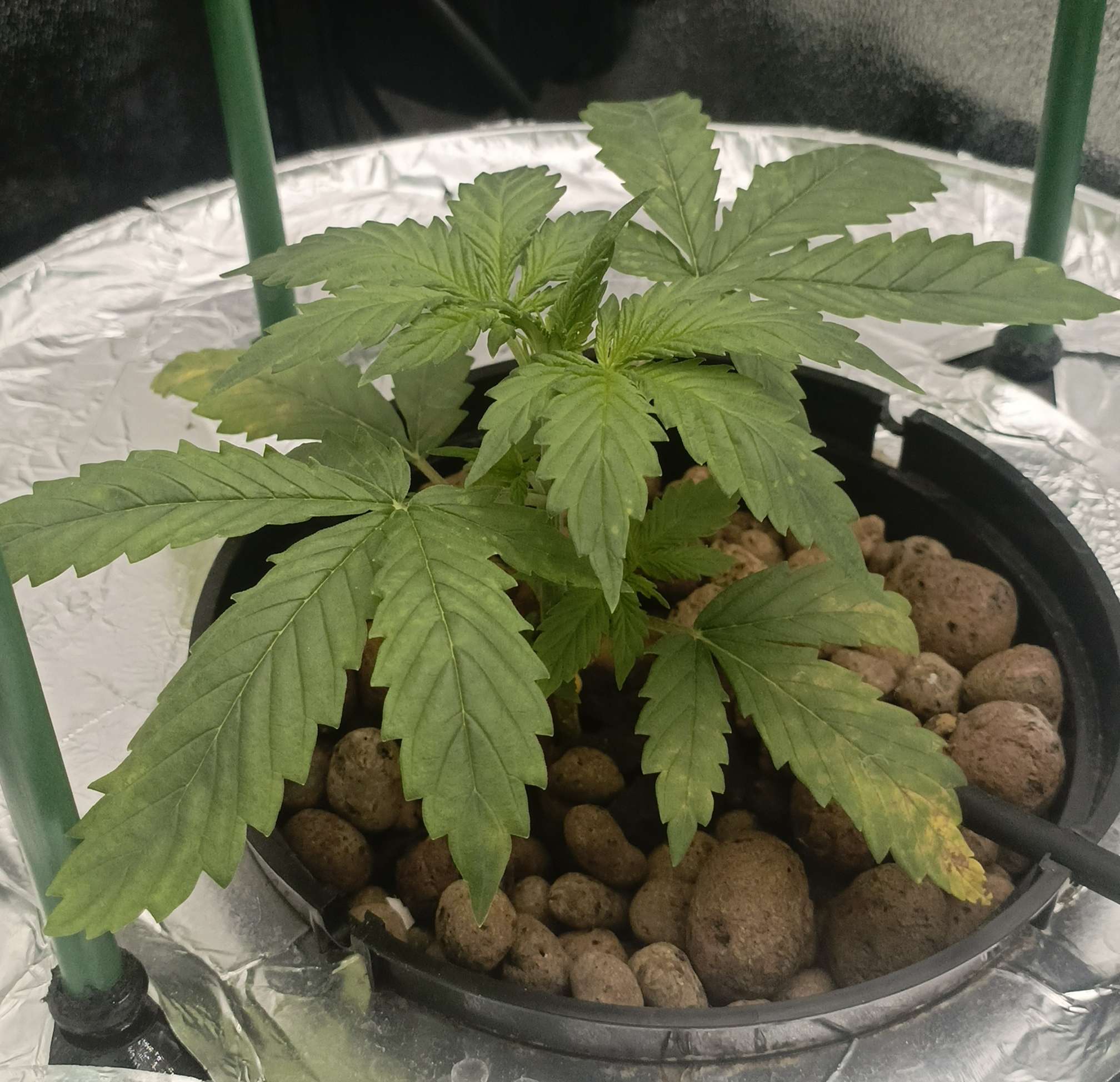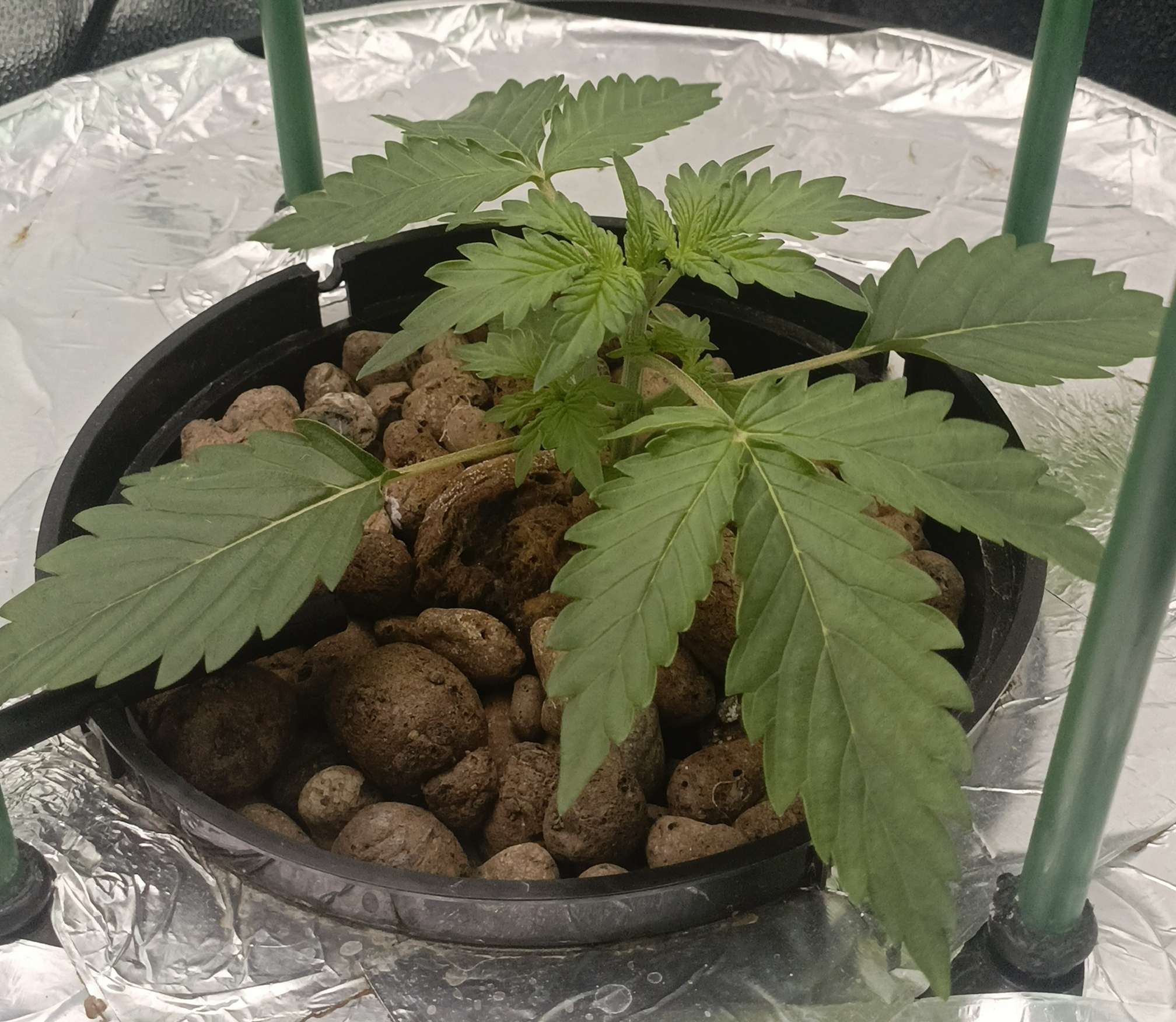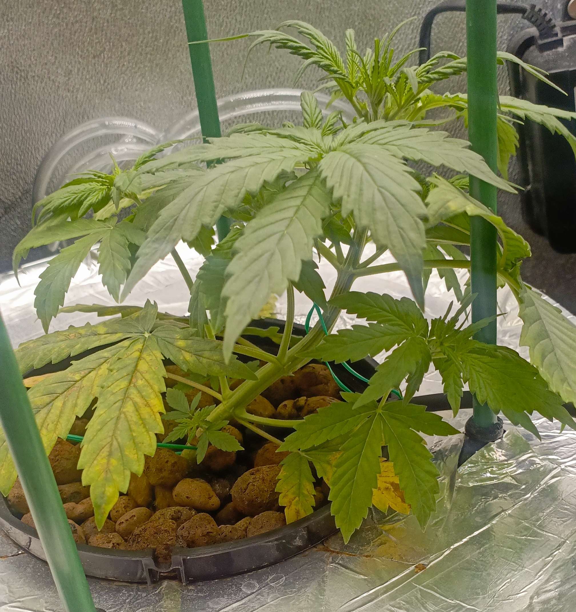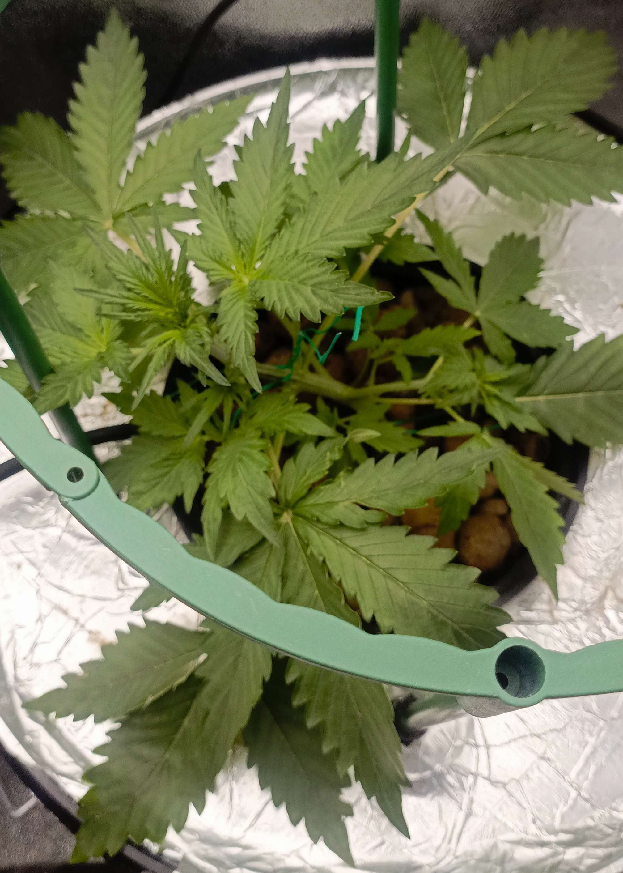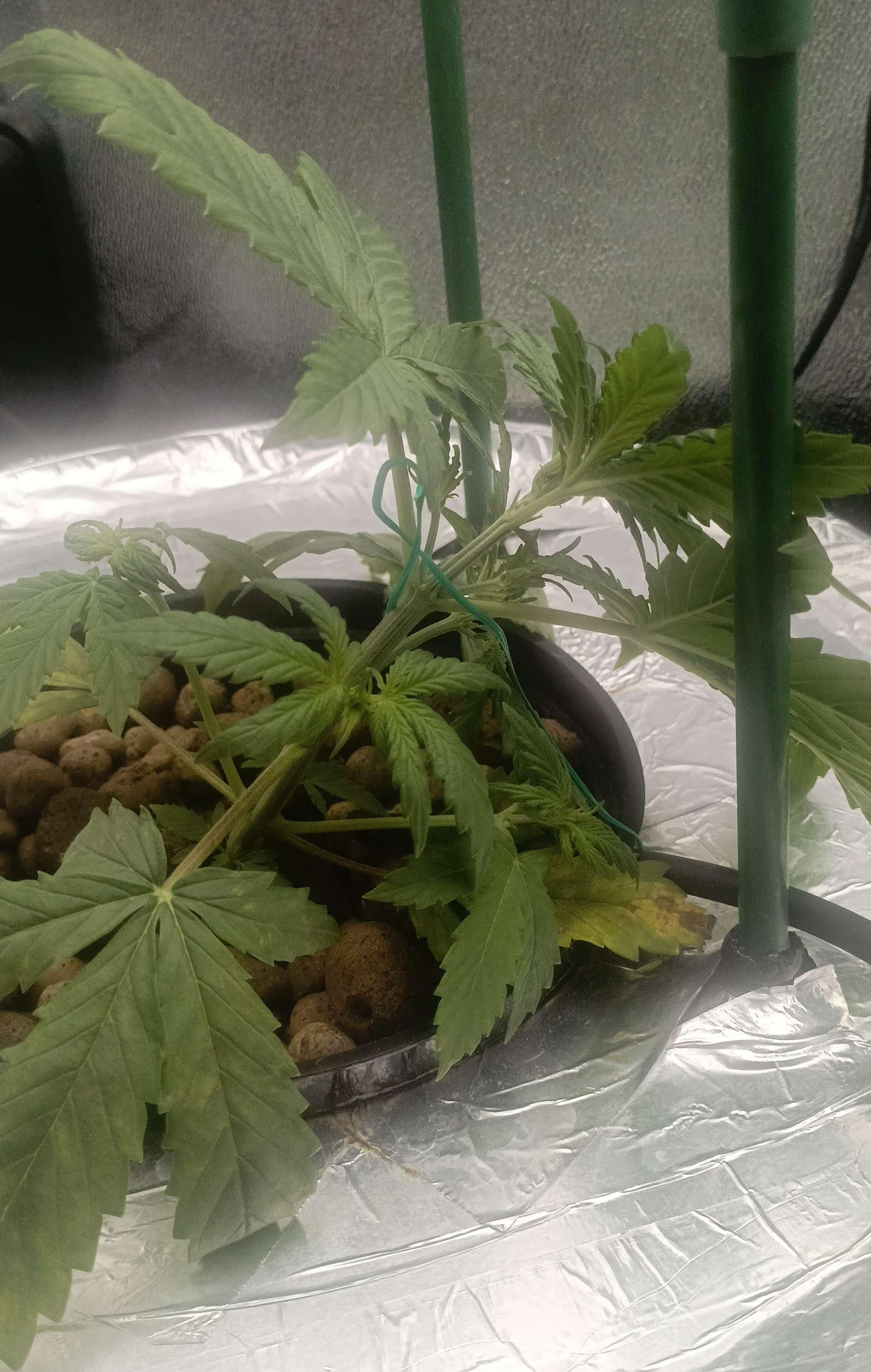 Из за стресса 1 Растишка чуть пожелтела, нижний уровень, верхний был в порядке поэтому в середине недели я начал потихоньку растягивать постепенно придавая нужную форму. Освещение 25000 - 30000 люкс. Раствор делал следующий: отрегулировав воду по PH, сначала добавляю и размешиваю cal mag 1,5 мл/л, потом органику pro roots 3мл/15л, diamond nectar 2мл/л и в конце минералку gro, micro, bloom по 1мл/л. EC - 1100. Также делаю в распылитель protect 5ml/l буду опрыскивать листву. В инструкции сказано не более 3 раз за цикл, поэтому делаю немного, раз в неделю, с этой начиная буду опрыскивать листву со всех сторон.