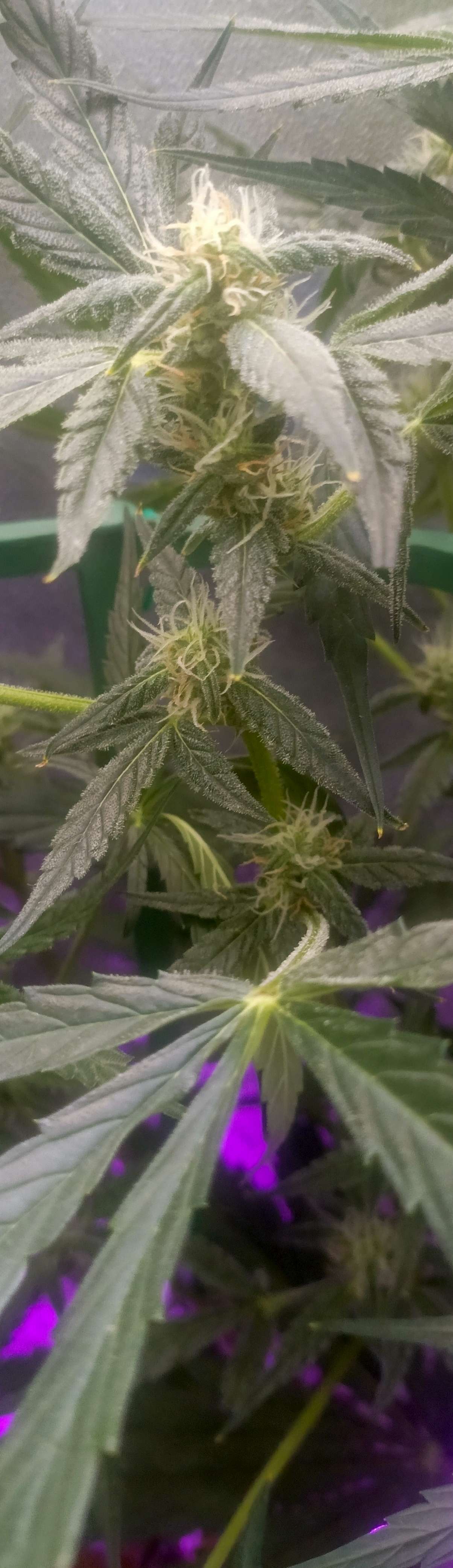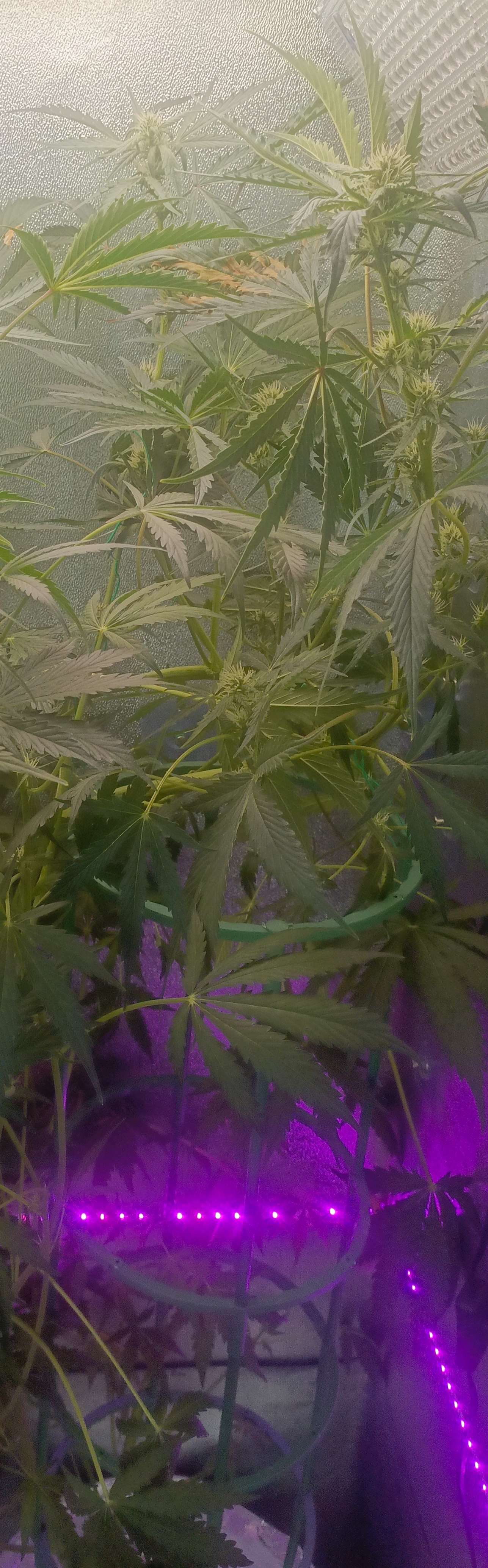 Произошёл форс мажор у одного растения проявился гемофродизм большую часть стеблей пришлось удалить. К сожалению фото не было сделано в этот неблагоприятный период. Поэтому дальше буду стараться довести до харва хоть одну растишку, второй сколько успеет набрать, все бананы с пыльцой были вовремя замечены и убраны путем отсечения веток. Не знаю из за чего это произошло, скорее всего стрессанул, после подгиба на стадии цветения. Но что характерно рост продолжается постоянно вытягивается, тогда как первое уже неделю набирает массу на шишки...