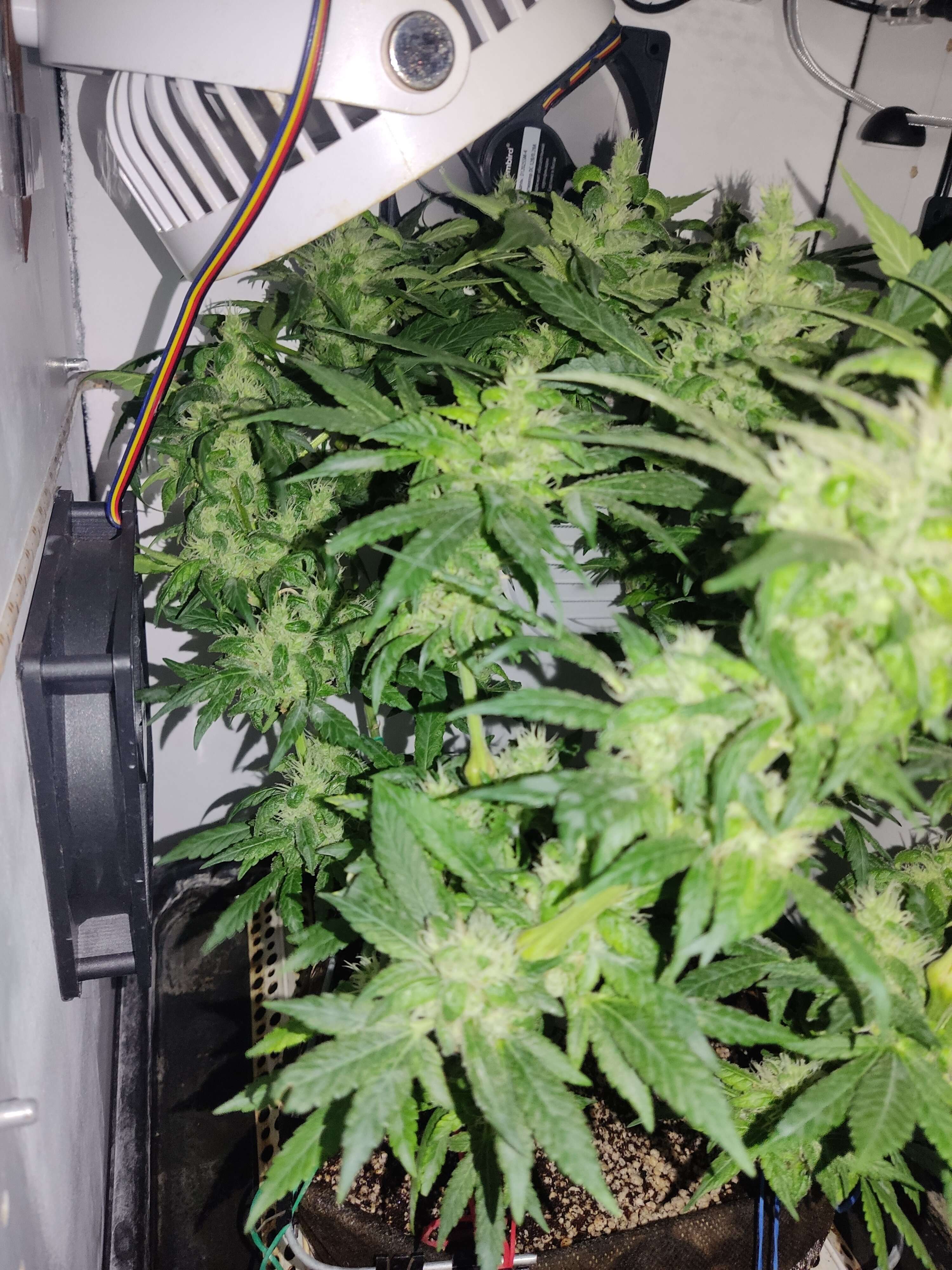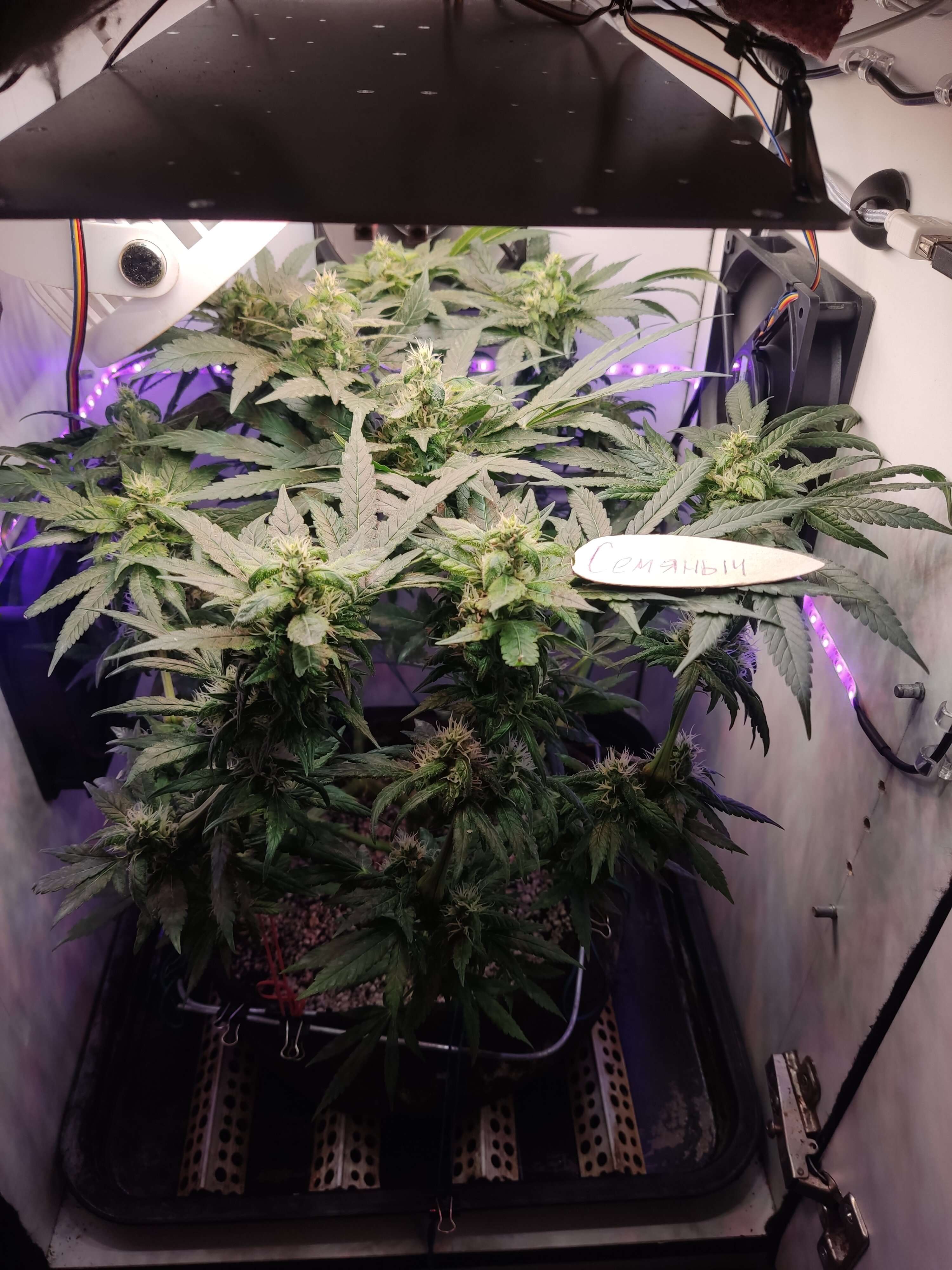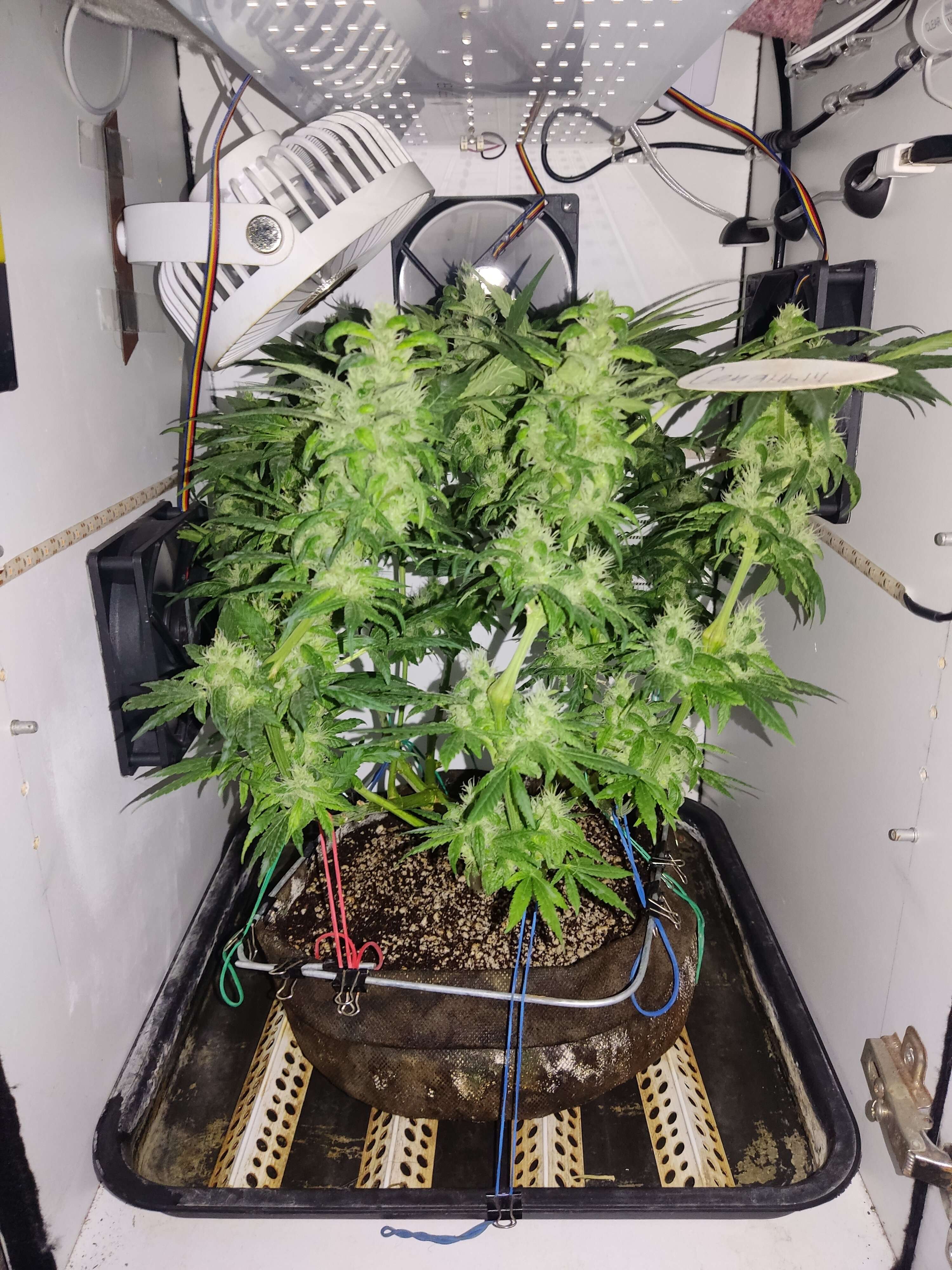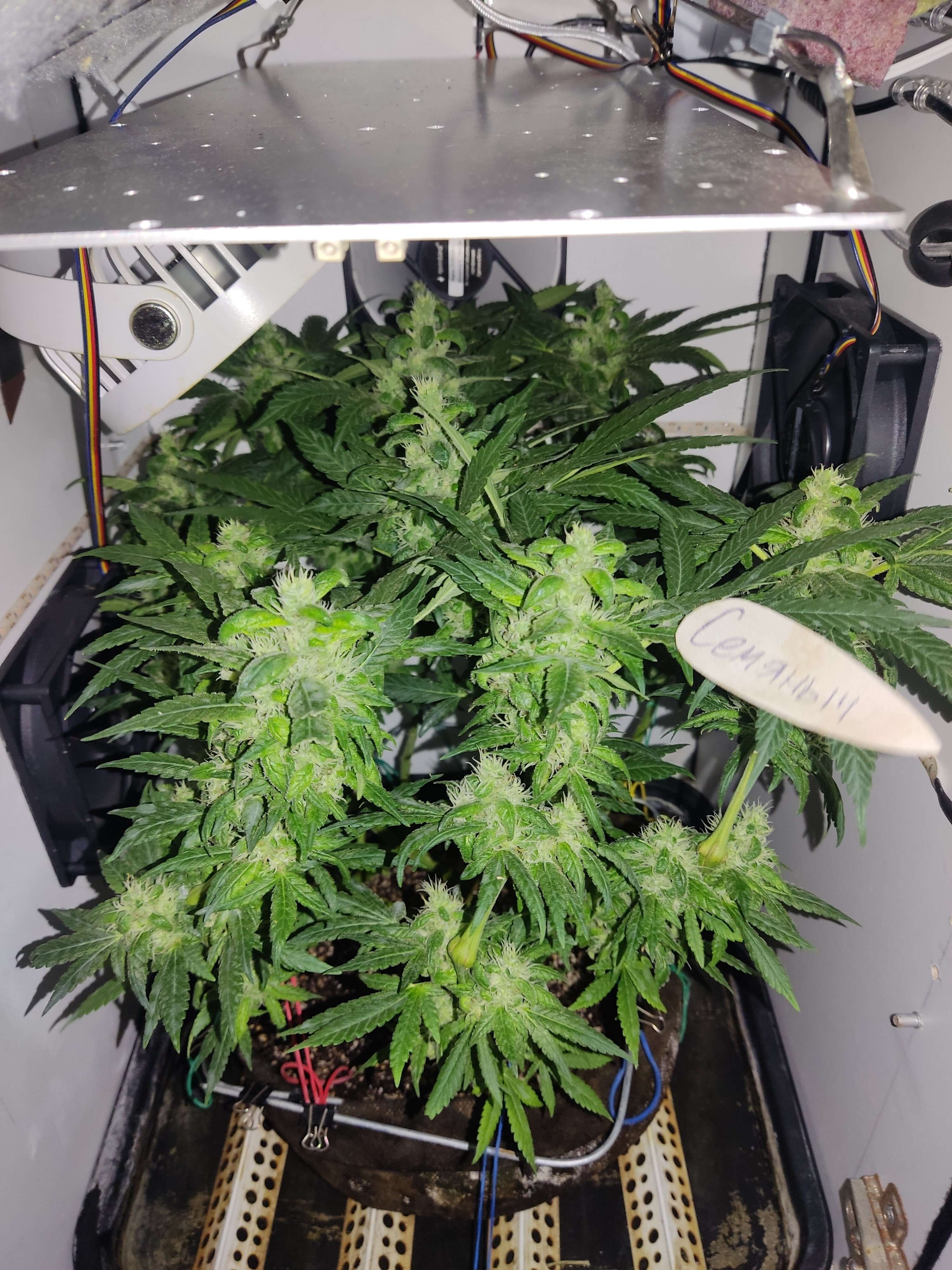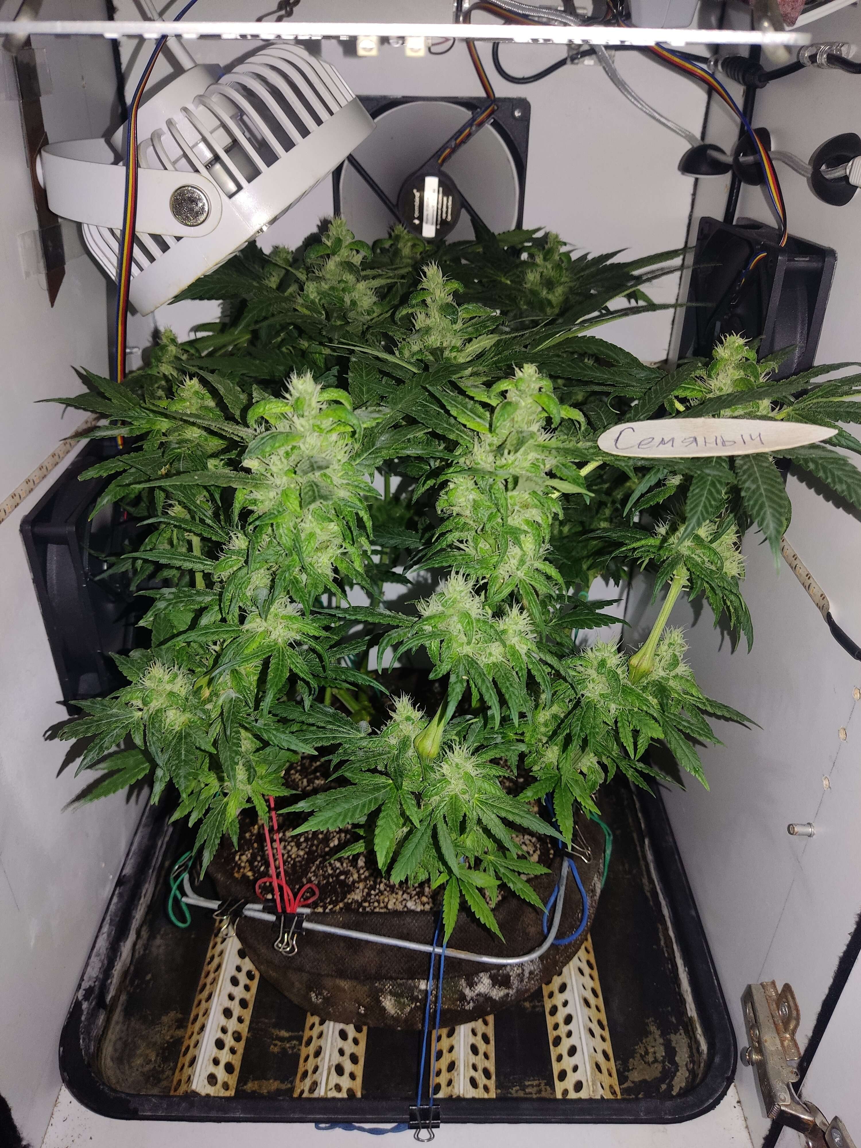 По паспорту осталось 10 дней, в целом медленно, но верно набирает массу, обсыпается трихомами. К сожалению осушитель придет только к концу грова, не получится стимулировать образование трихом сухим воздухом. Сегодня дал плотный компот, посмотрим как отреагирует, может быть тормозит от недостатка питания. Стигмы пока все белые.