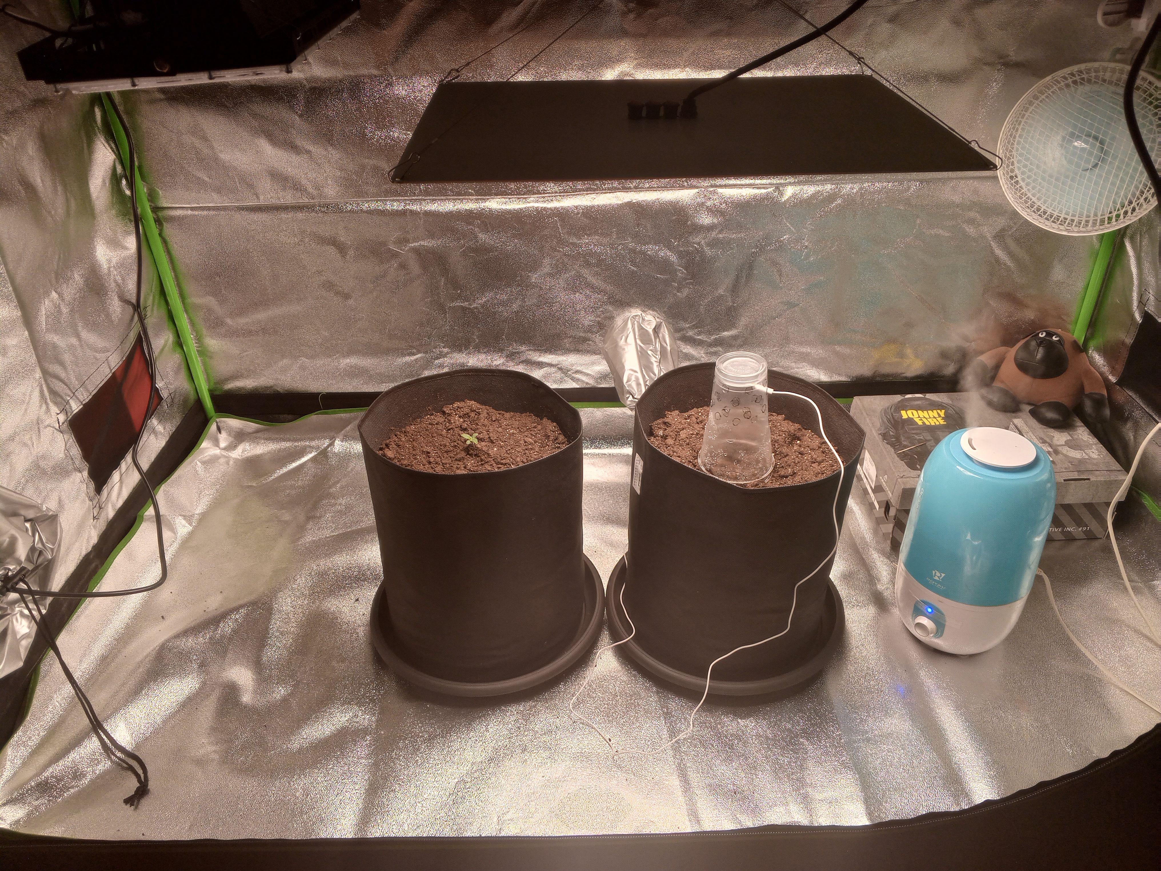 Землю пропитал чистой покупной водой водой из магазина. Влил в каждый горшок по 0,5 разведённого и выровненного до рН 6,3 компота микробов TrikoLogic в 1-ом л. воды. Ничем не удобрял. Сидим ждём. Прокачал 500Вт "типолампу" радиатором и кулером 220В 120х120х38 мм, АС, подшипник скольжения, чтобы не сгорела. Она к тому же ещё и мерцает при съёмке. Пускай висит на подсвете. Лишней не будет. Борд на 40% примерно диммер выкрутил. Расстояние борда 35 см. примерно от растишки.