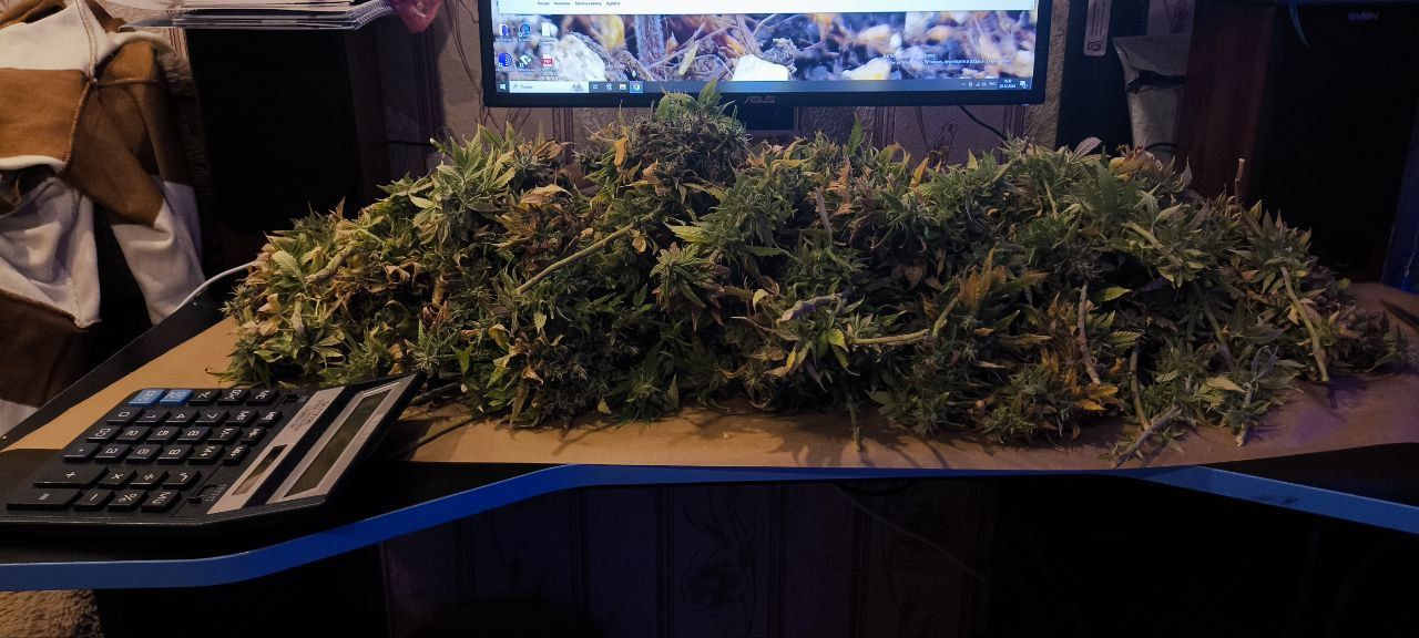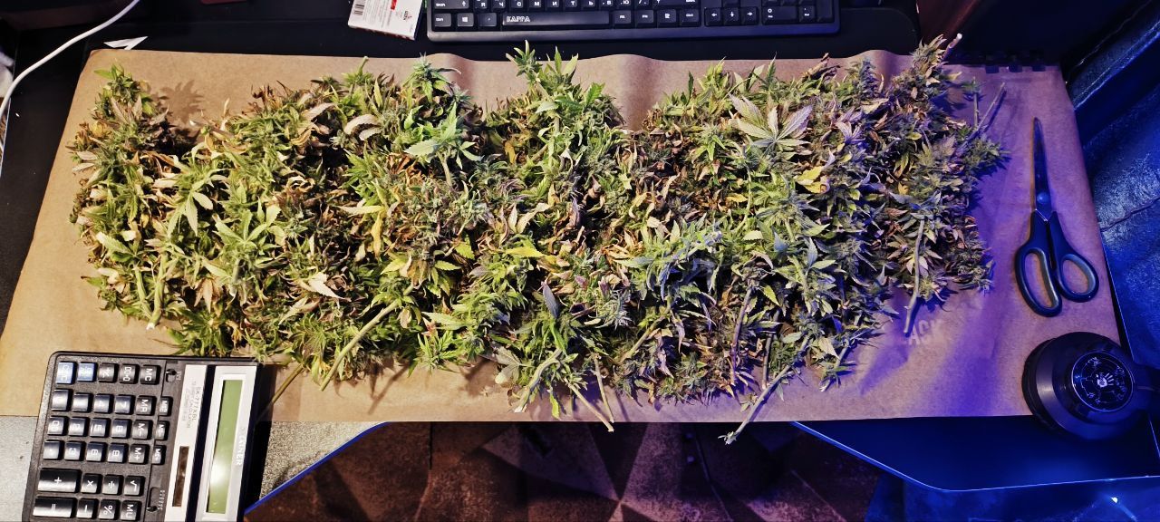 Срезана куча шиш. Глубокий маникюринг листиков, легкий трим феолетовых и получается 1182 грамма сырых шиш на веточках.
